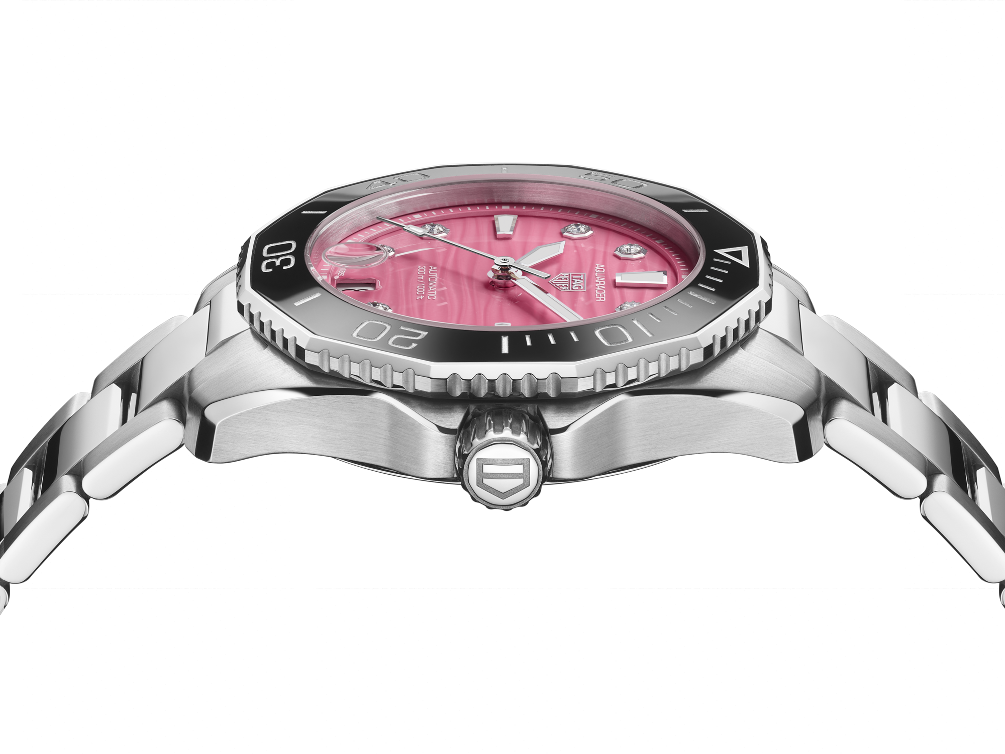 The wavy dial pattern of the TAG Heuer Aquaracer stands out in vivid pink, framed by the black ceramic bezel and accented with VS diamond diameter 1.40mm 0.07CT hour markers.