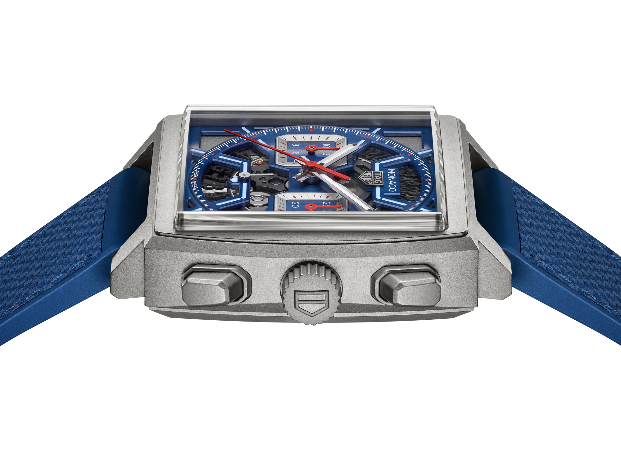Featured on a TAG Heuer Monaco for the first time, the blue embossed leather and rubber strap is as sporty on the wrist as it is versatile on the track.
