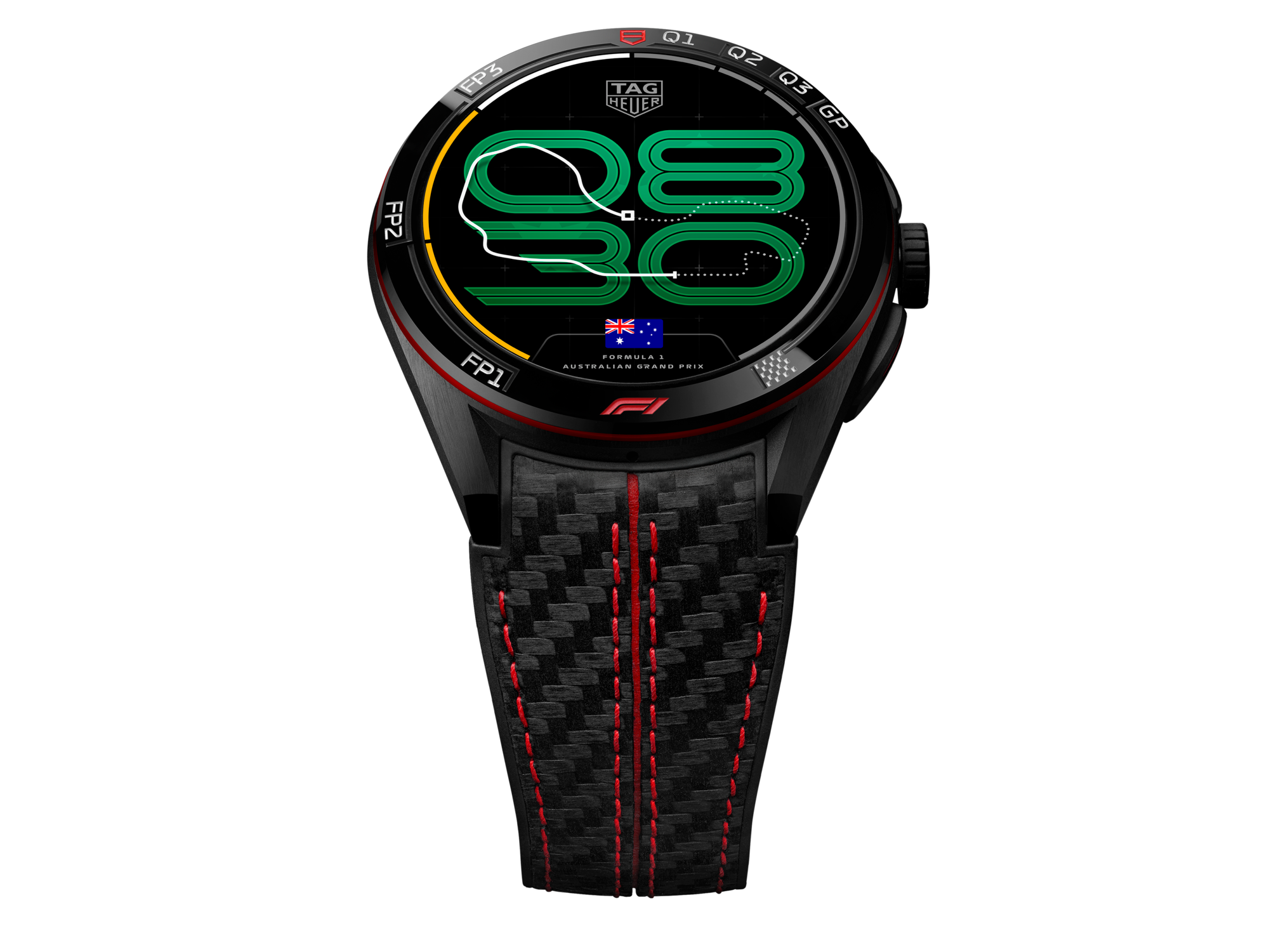 At the heart of this edition is a suite of 24 exclusive Race Track watch faces, each inspired by the circuit hosting the next Grand Prix™. Updated throughout the season, they visually celebrate every stage of race weekend action. The black ceramic bezel, engraved with all Grand Prix™ phases and highlighted by the F1® logo at 6 o'clock, anchors this racing-driven design.