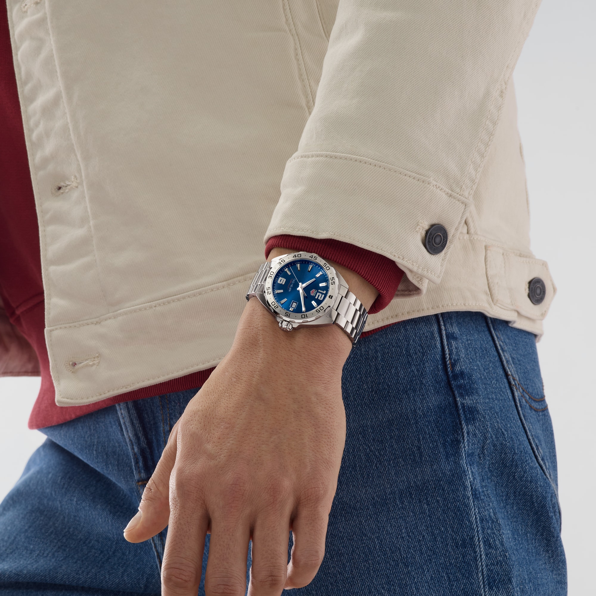 The 41mm steel watch case is ringed by a 60-minute scale unidirectional turning bezel. The brushed steel bracelet closes with a steel folding clasp with double safety system and a driving extension for fitting over the sleeve of a racing suit.