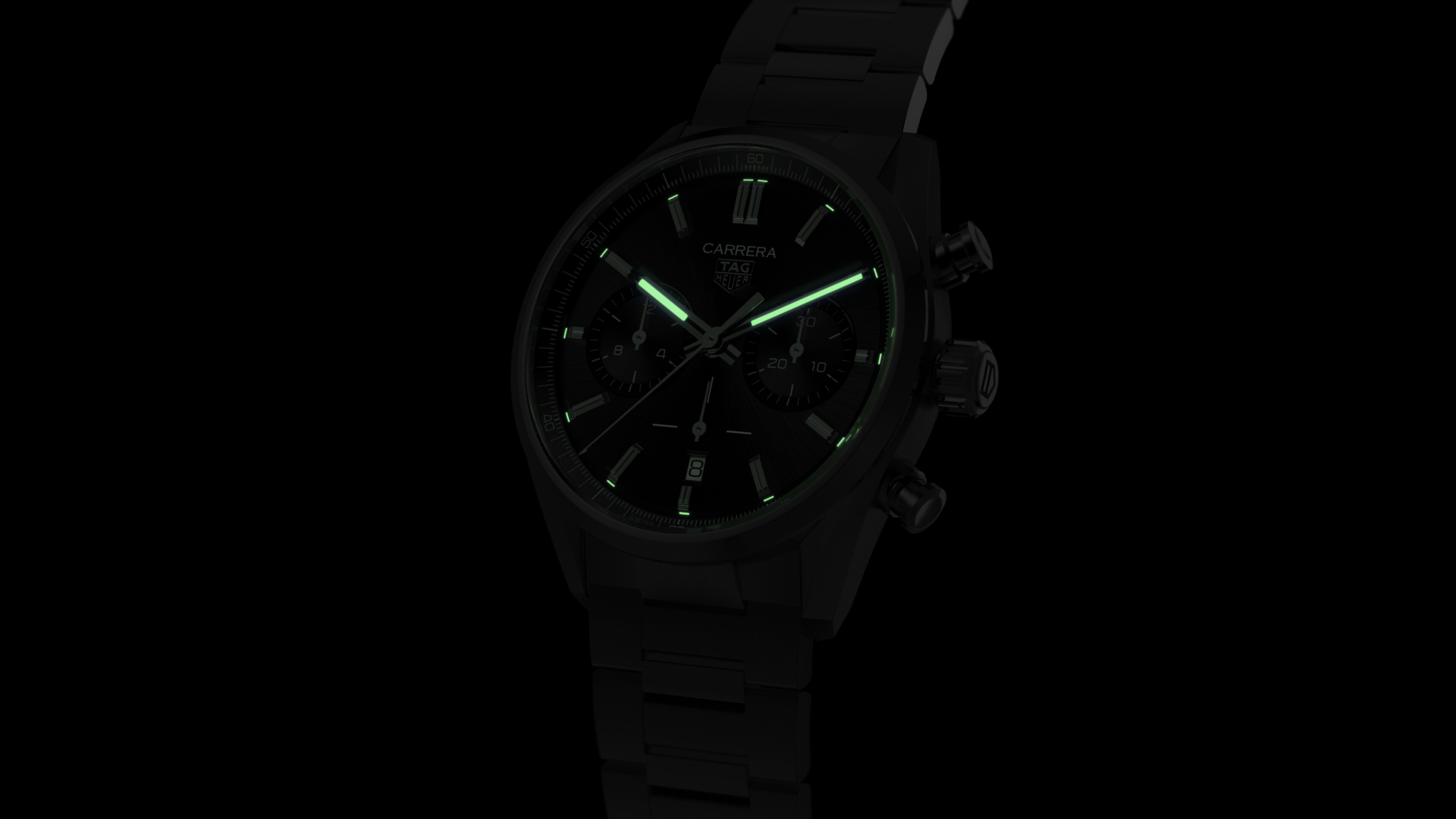 镀铑时标、时针、分针与中央指针在黑色太阳纹磨砂表盘的映衬下熠熠生辉,可在高速运动和任何环境条件下确保清晰读时。