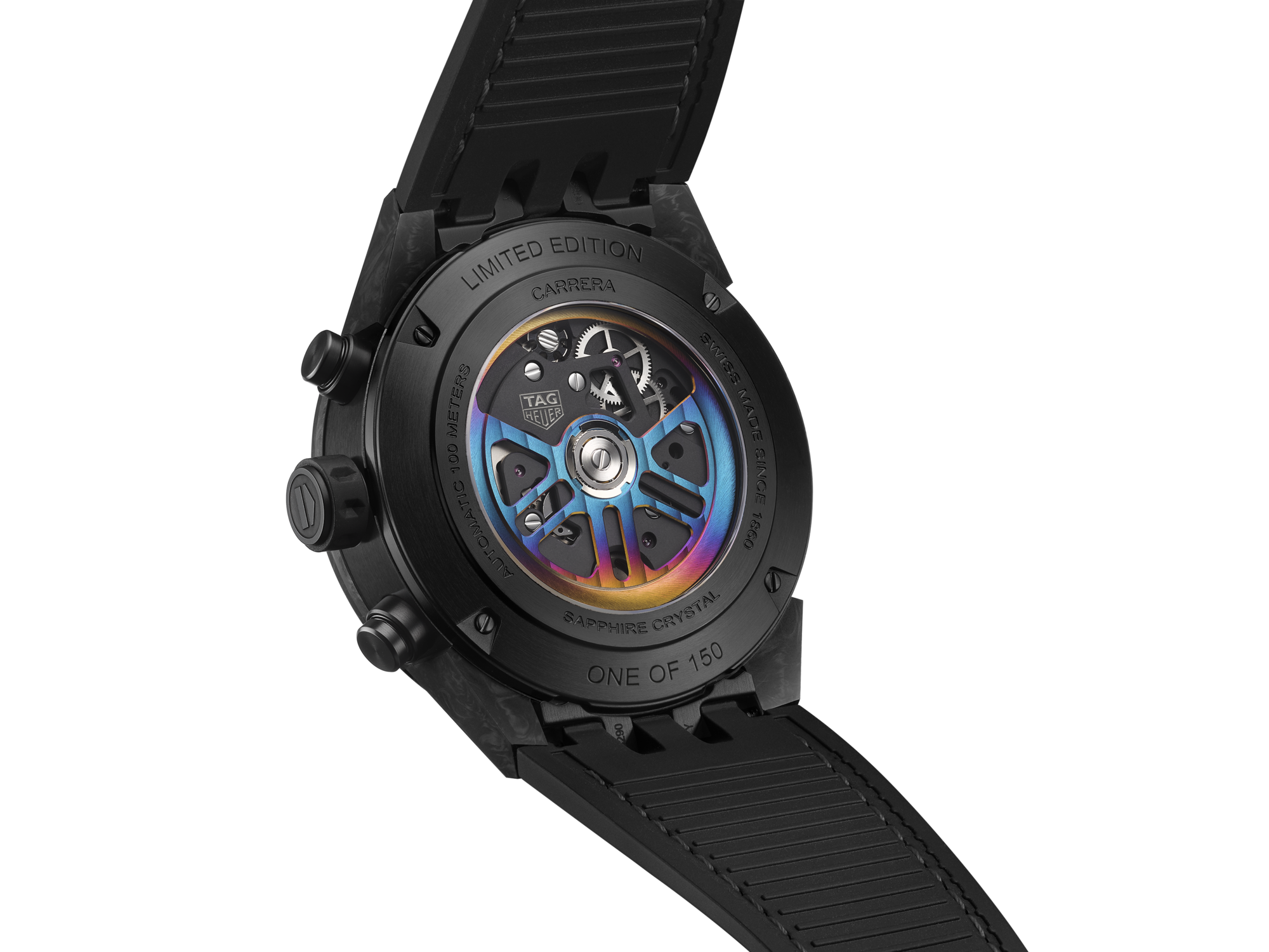 黑色钛金属表壳和碳材质表圈精巧勾勒出这款泰格豪雅卡莱拉系列陀飞轮腕表别致华美的彩虹表盘。限量150枚,标志性设计的自信果敢表达,尽显鲜明个性力量。