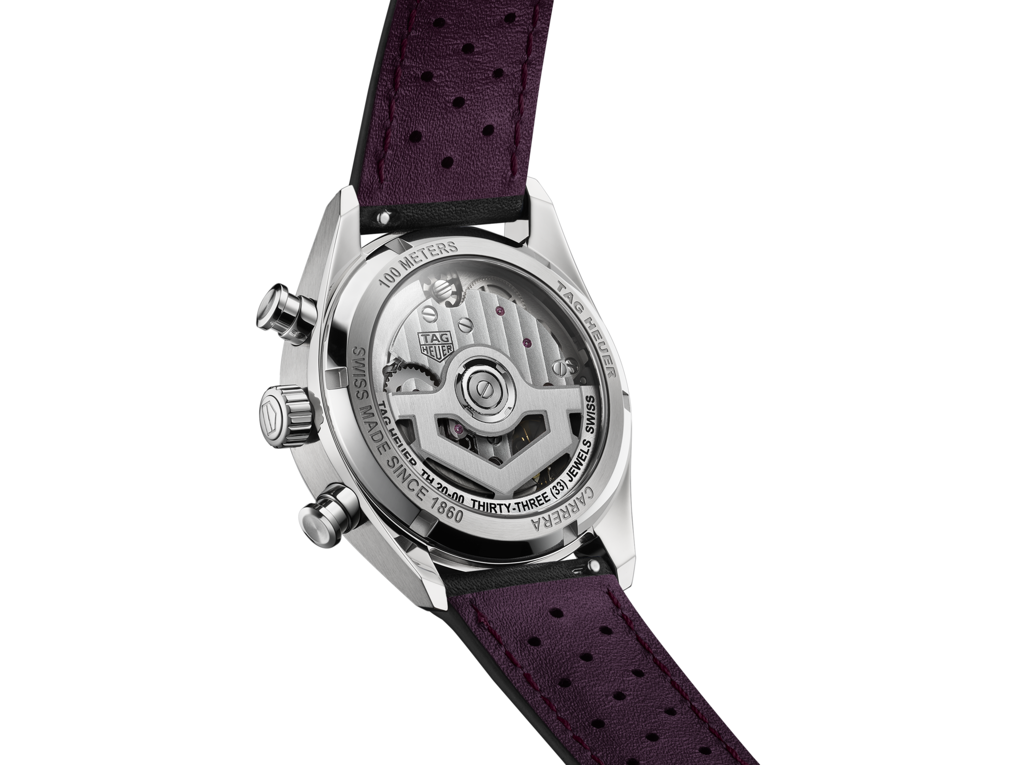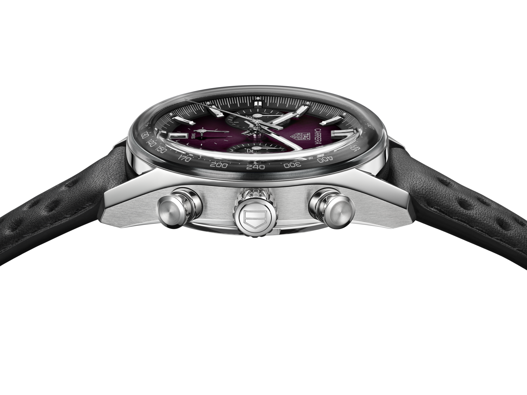 TAG Heuer Carrera(卡萊拉)計時腕錶將尖端設計與鮮艷色彩完美融合,昇華您的風格。這款腕錶配備醒目的煙燻紫色放射狀太陽紋磨砂錶面,將精準與優雅完美融合,是適合任何場合佩戴的獨特中性腕錶。