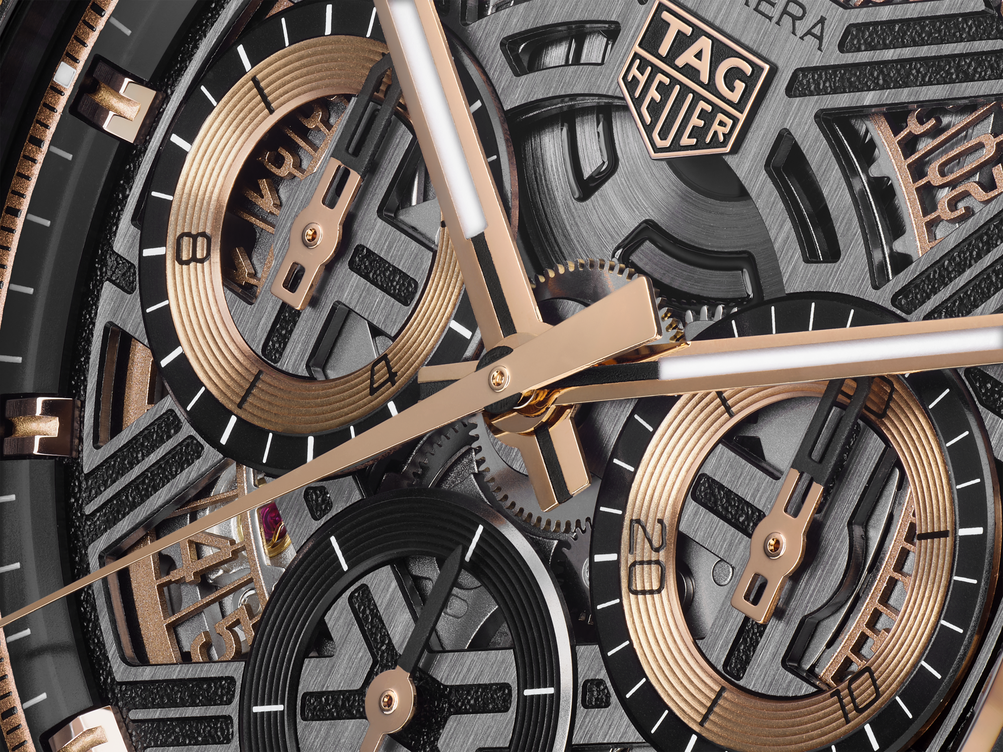 錶殼採用經精細磨砂和拋光的18K 5N玫瑰金製成,鏤空的側面展現獨特建築美感,襯以固定測速刻度錶圈及黑色DLC塗層鈦金屬錶冠。腕錶搭載TH20-00機芯,提供80小時動力儲存。