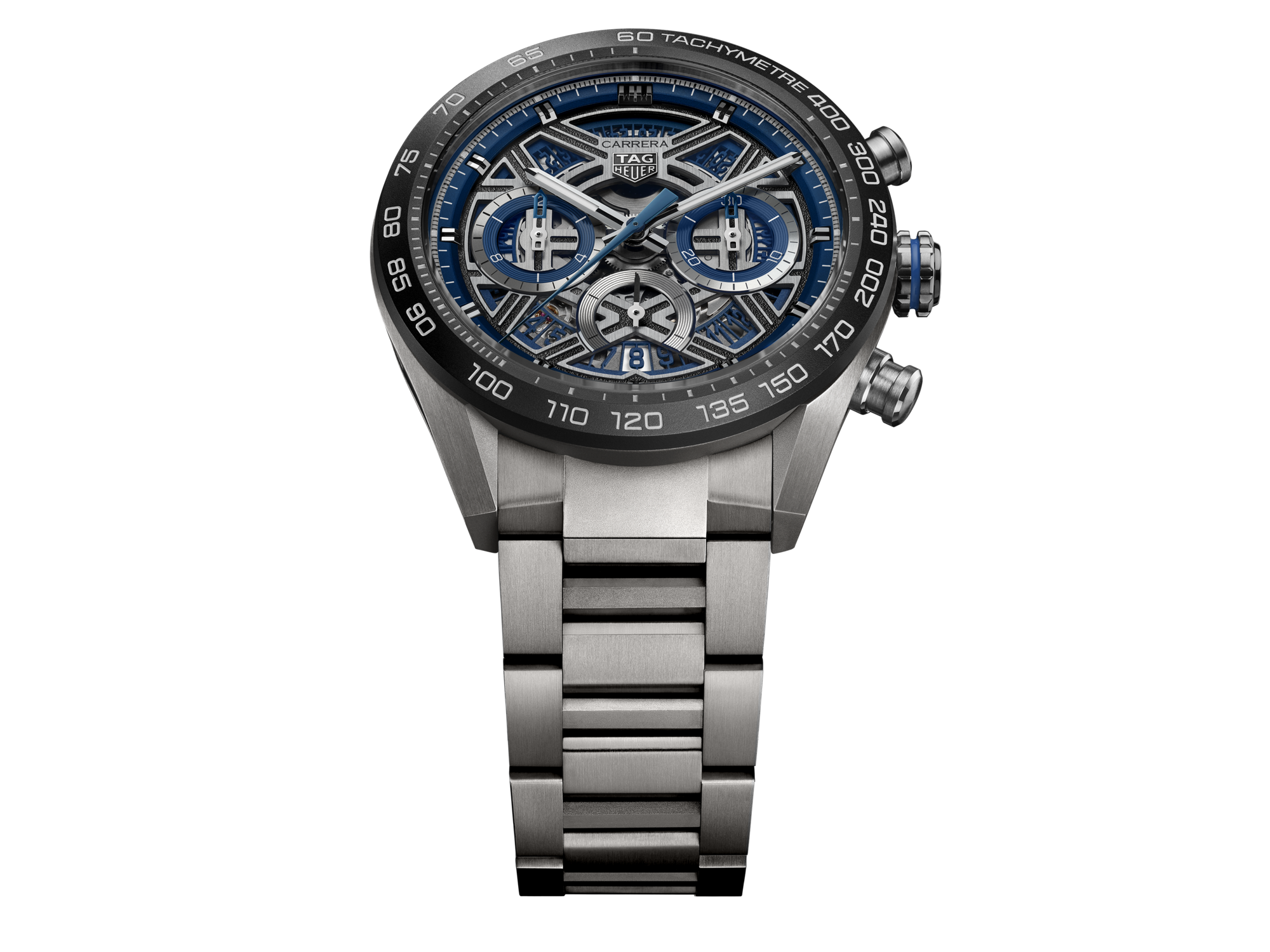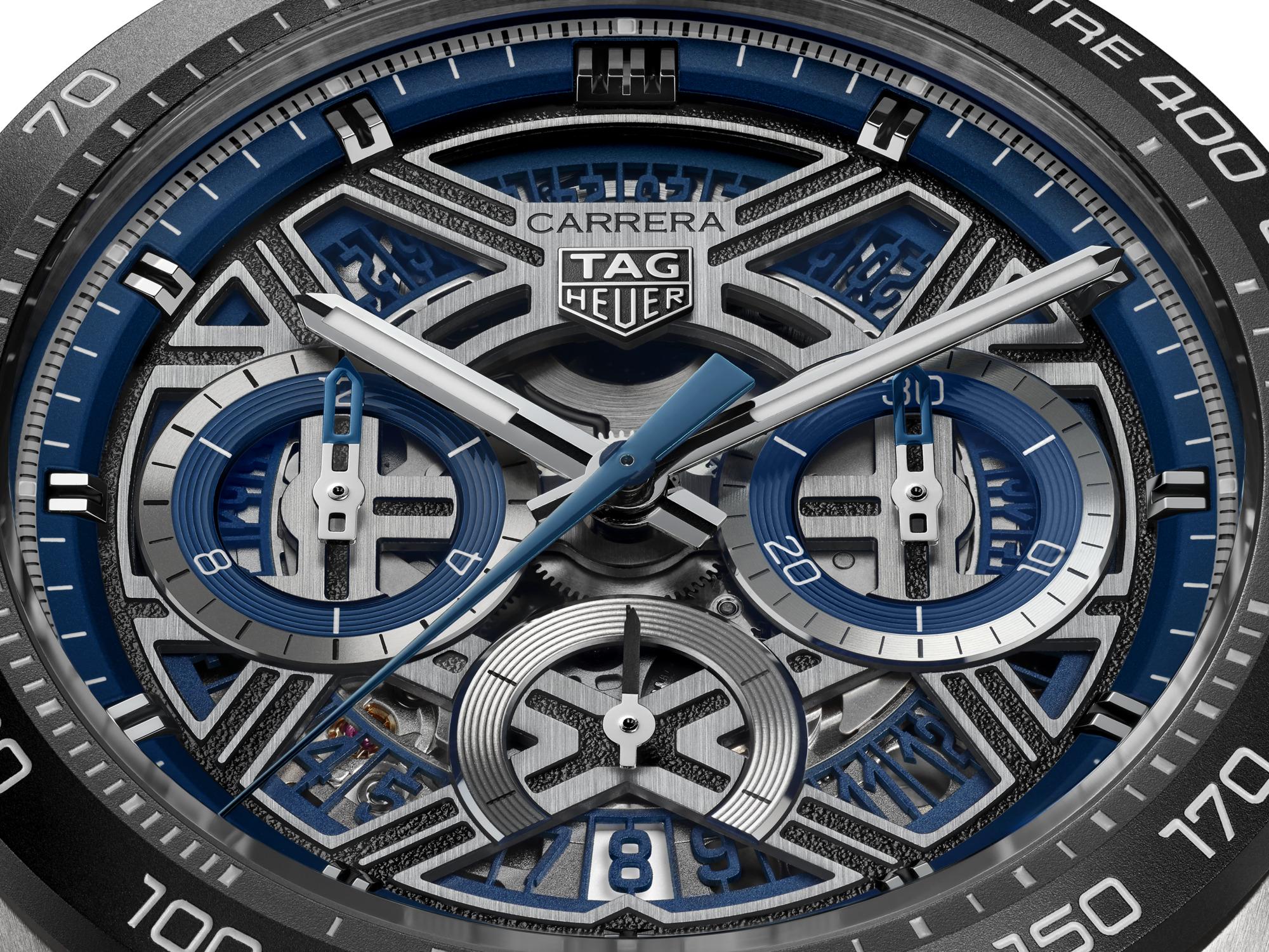 鏤空錶面體現速度與創新的精髓,環繞矚目的藍色外緣,各計時盤均飾有對比藍色細節。鍍銠指針與刻度塗覆白色Super-LumiNova®夜光塗層,確保在高速運動中亦能清晰讀時。6點鐘位置設有日期視窗,使這款為性能而設的腕錶更添實用。
