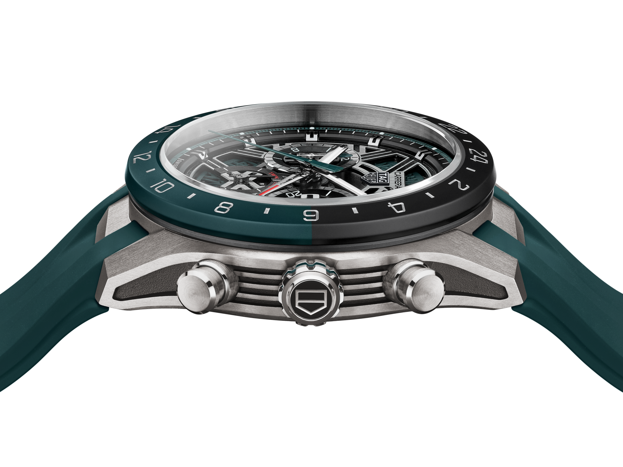 The integrated teal green rubber strap, paired with a titanium folding clasp and fine adjustment system, offers an ergonomic fit for all-day wear. Combining comfort with resilience, this strap perfectly complements the watch’s bold design.