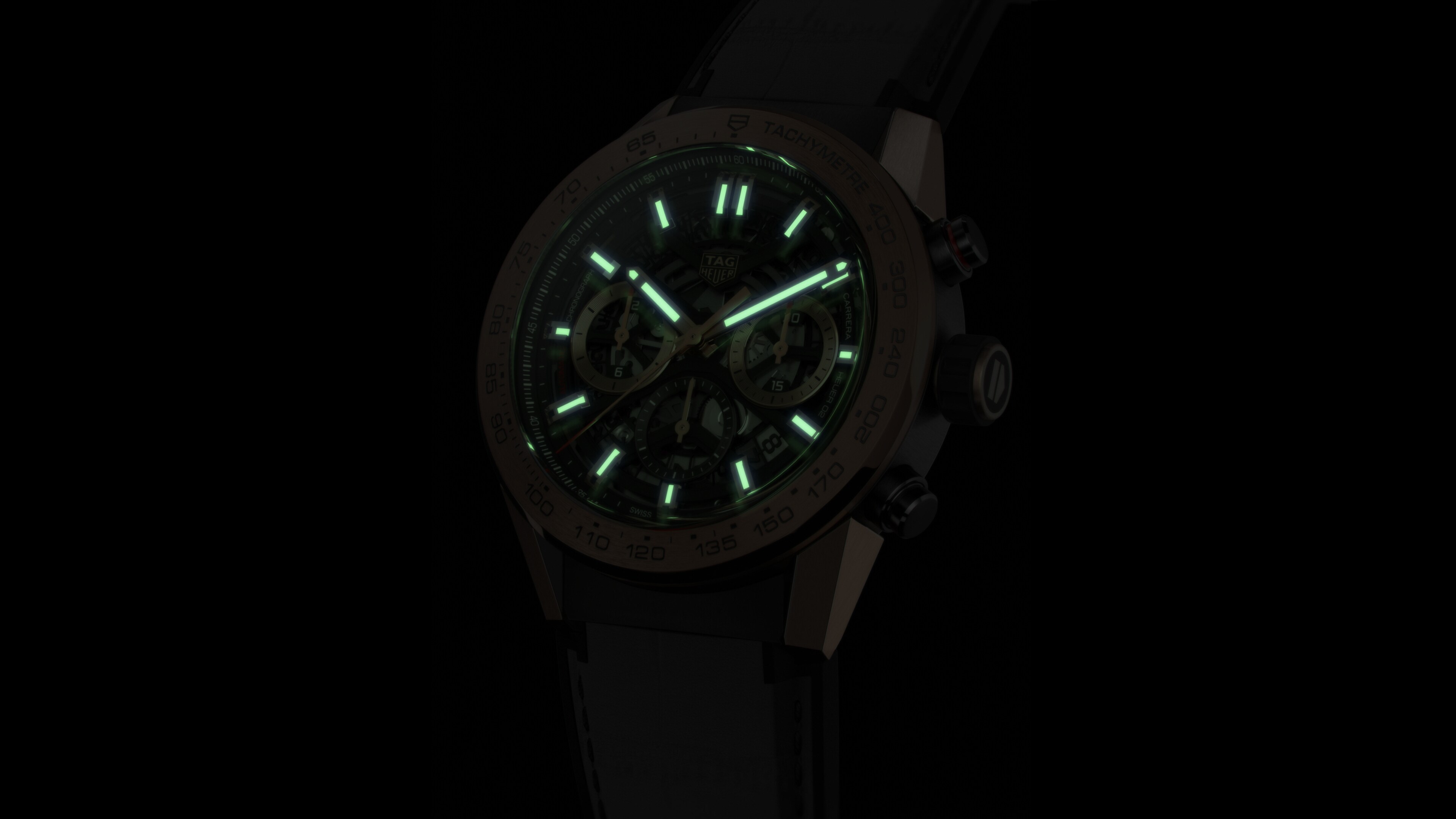 Curved sapphire crystal with double anti-reflective treatment protects the dial, which is housed in a 45mm black PVD steel case. The Manufacture automatic movement Heuer 02 can be seen through the sapphire case back, and provide a stunning 80 hours power reserve.