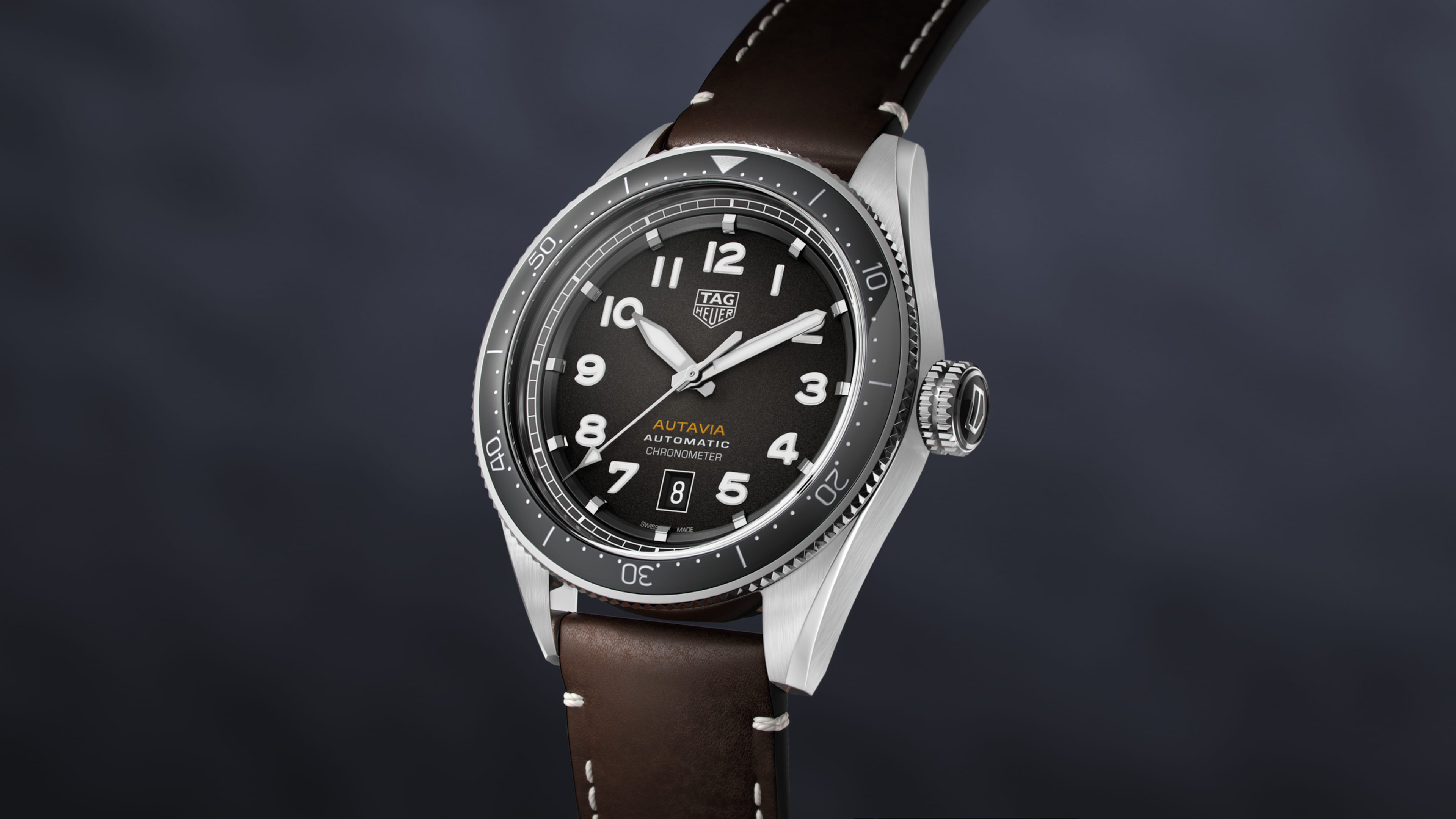 The oversized crown, Arabic numerals and sword-shaped hands take inspiration from Heuer pilot watches and timers from 1933 to 1957. The dial is smoked brown, the ceramic 60-minute bezel rotates bi-directionally. The rounded stainless-steel case and beveled lugs echo those of the Autavia from the 1960s.