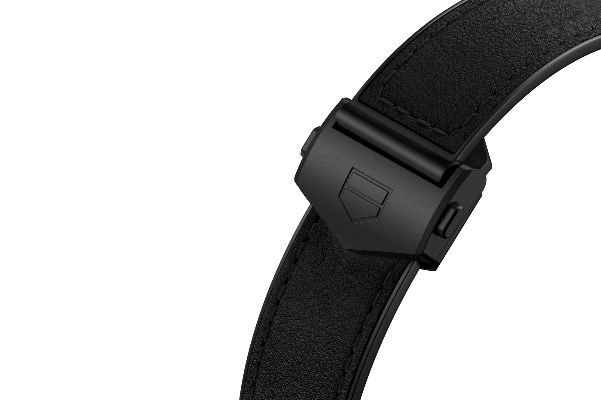 Mixing calfskin leather and rubber, the ultra-resistant black strap integrates a black DLC grade 2 titanium folding clasp for absolute comfort on the go.
