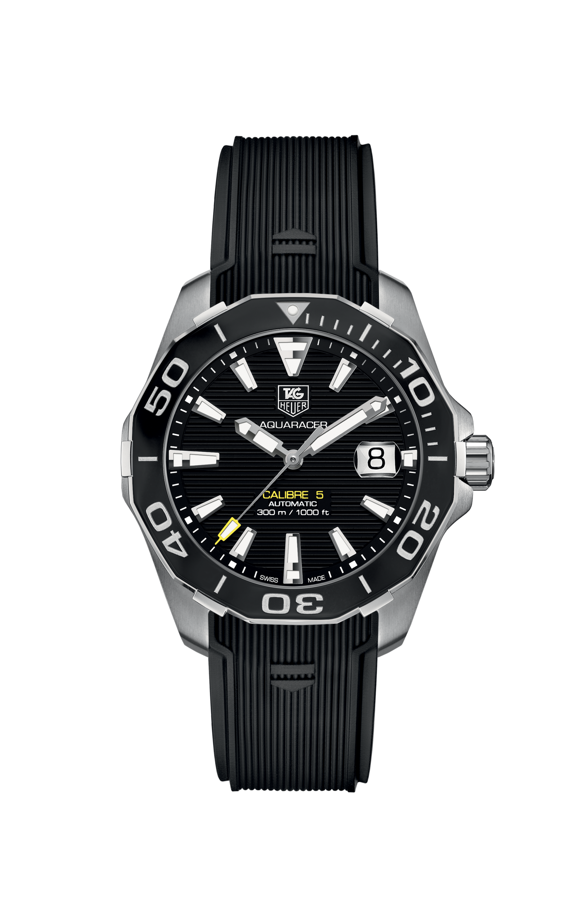 Swiss-made, this bold TAG Heuer Aquaracer is an aesthetic 41 mm watch. This model features a Steel case and a Calibre 5 Automatic movement.