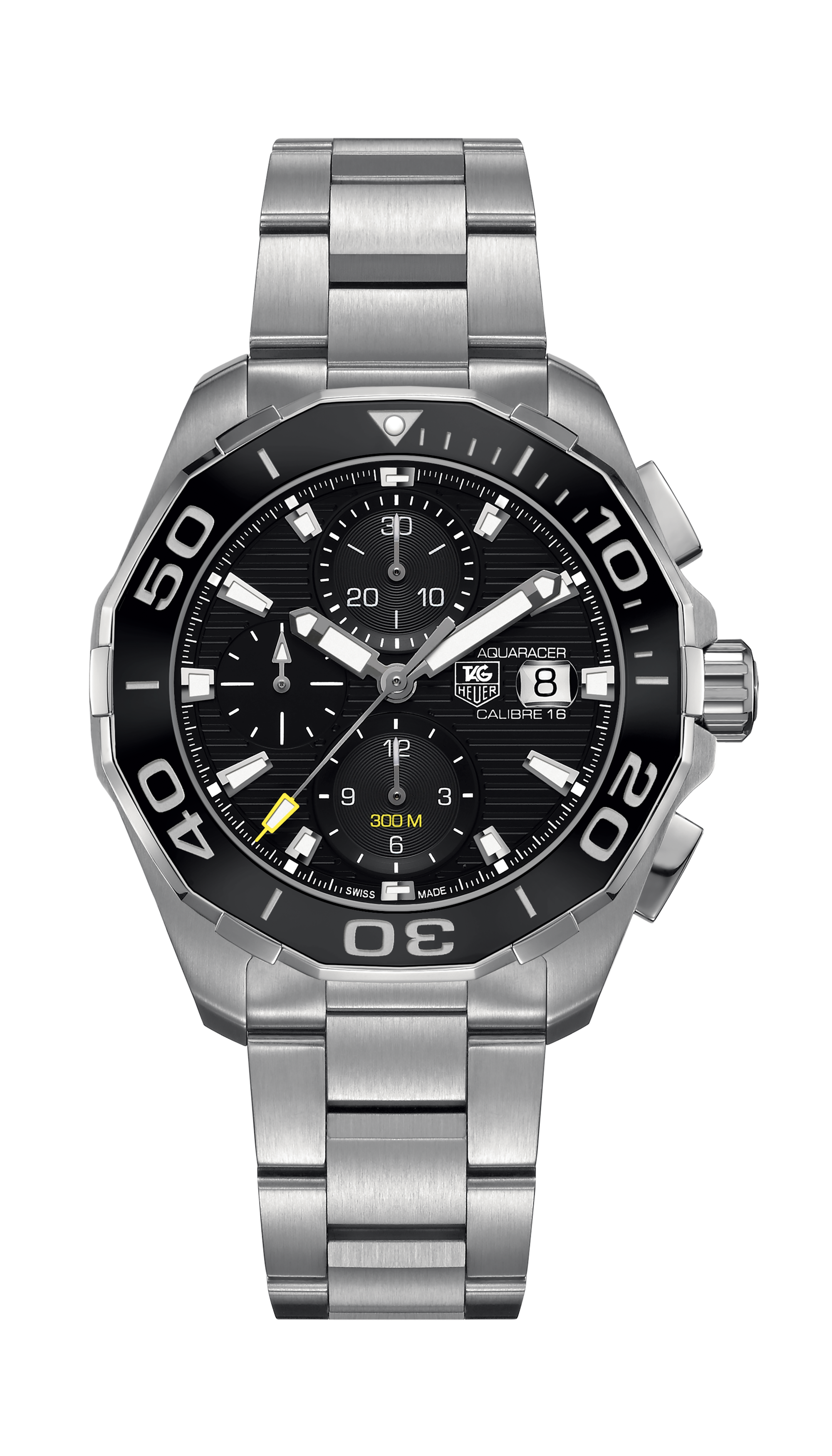 Swiss-made, this bold TAG Heuer Aquaracer is an aesthetic 43 mm watch. This model features a Steel case and a Calibre 16 Automatic movement.
