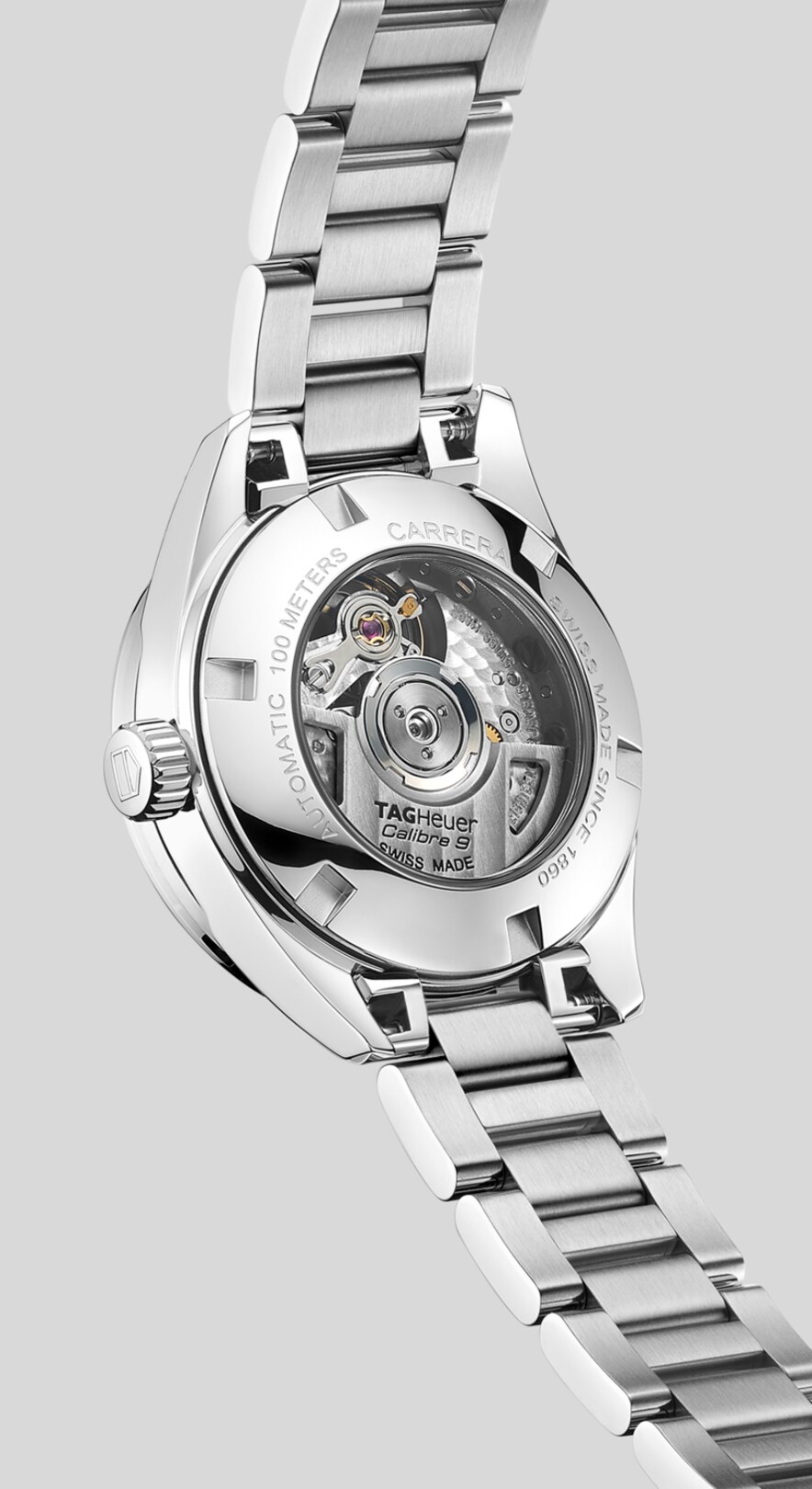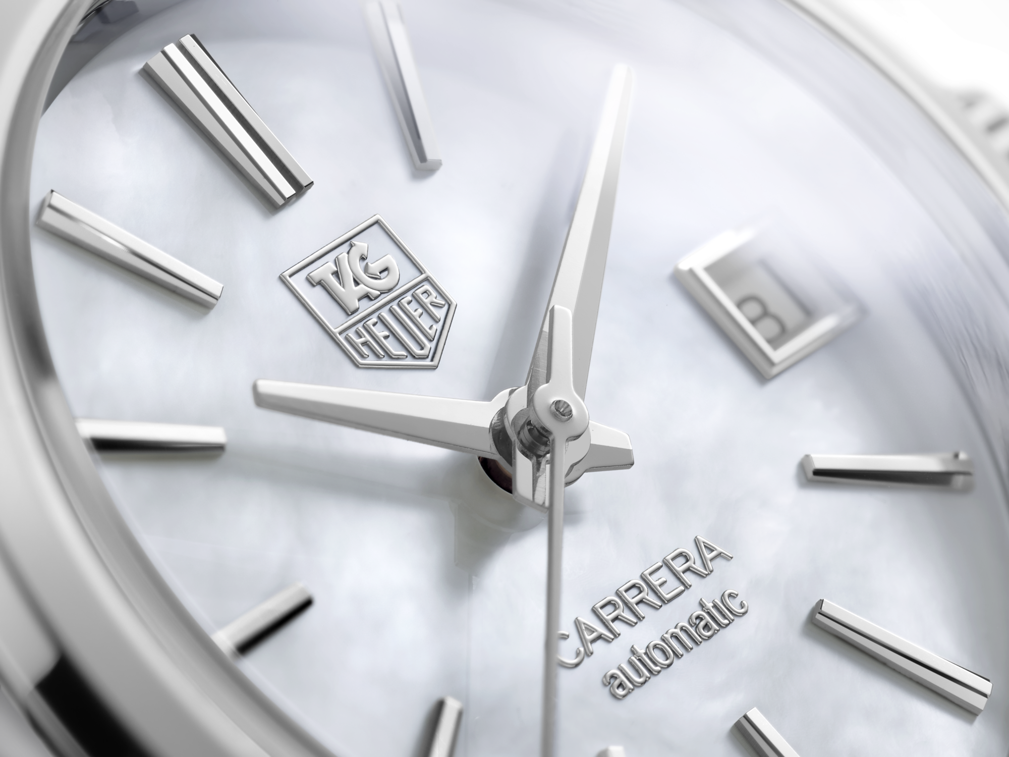Automatic, 28 mm, Steel WAR2411.BA0776A very chic edition of the TAG Heuer Carrera Lady, with a Calibre 9 automatic movement and slim sliver-toned indexes on a luminous mother-of-pearl dial. The look is elegant, perfect for casual and dressiest occasions.