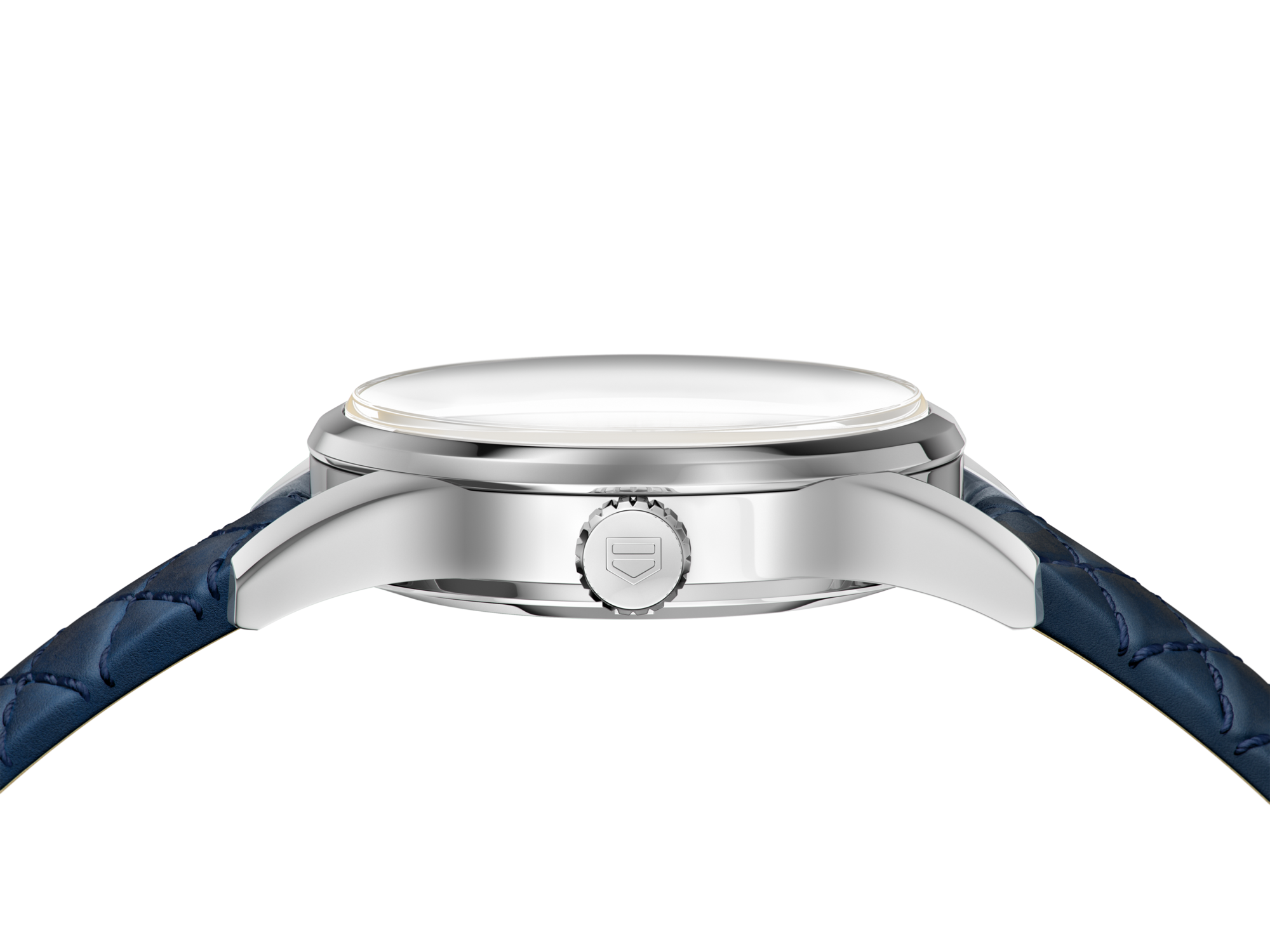An audacious haute-couture TAG Heuer Carrera Lady for women seeking chic luxury style. The brushed blue dial inside the steel case glows with rose-gold plated indexes, hands and iconic TAG Heuer shield.