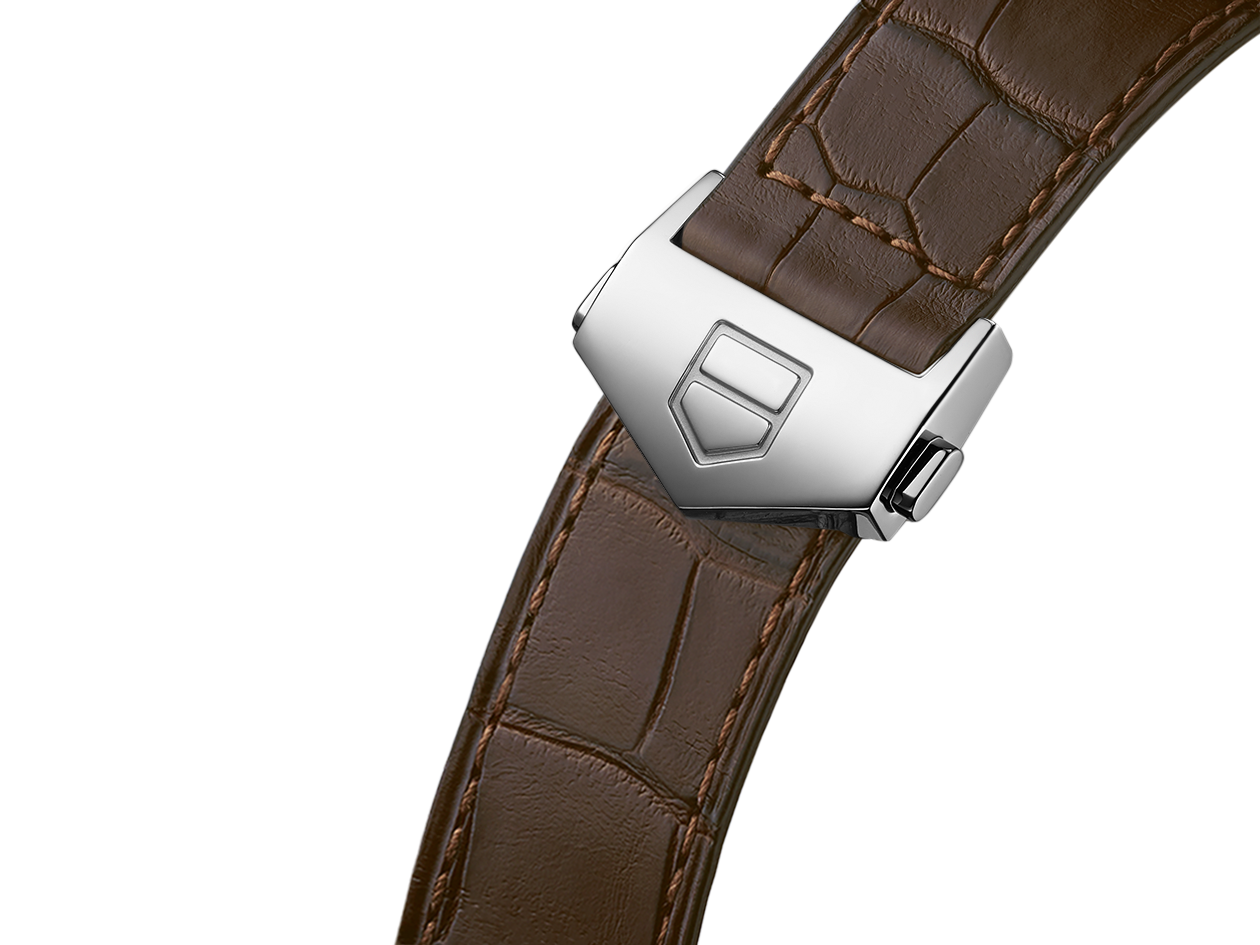 An elegant three-hand watch with white dial, classic TAG Heuer Carrera lugs and a brown alligator strap. Inside the 39mm steel case beats the robust Calibre 5 automatic movement.