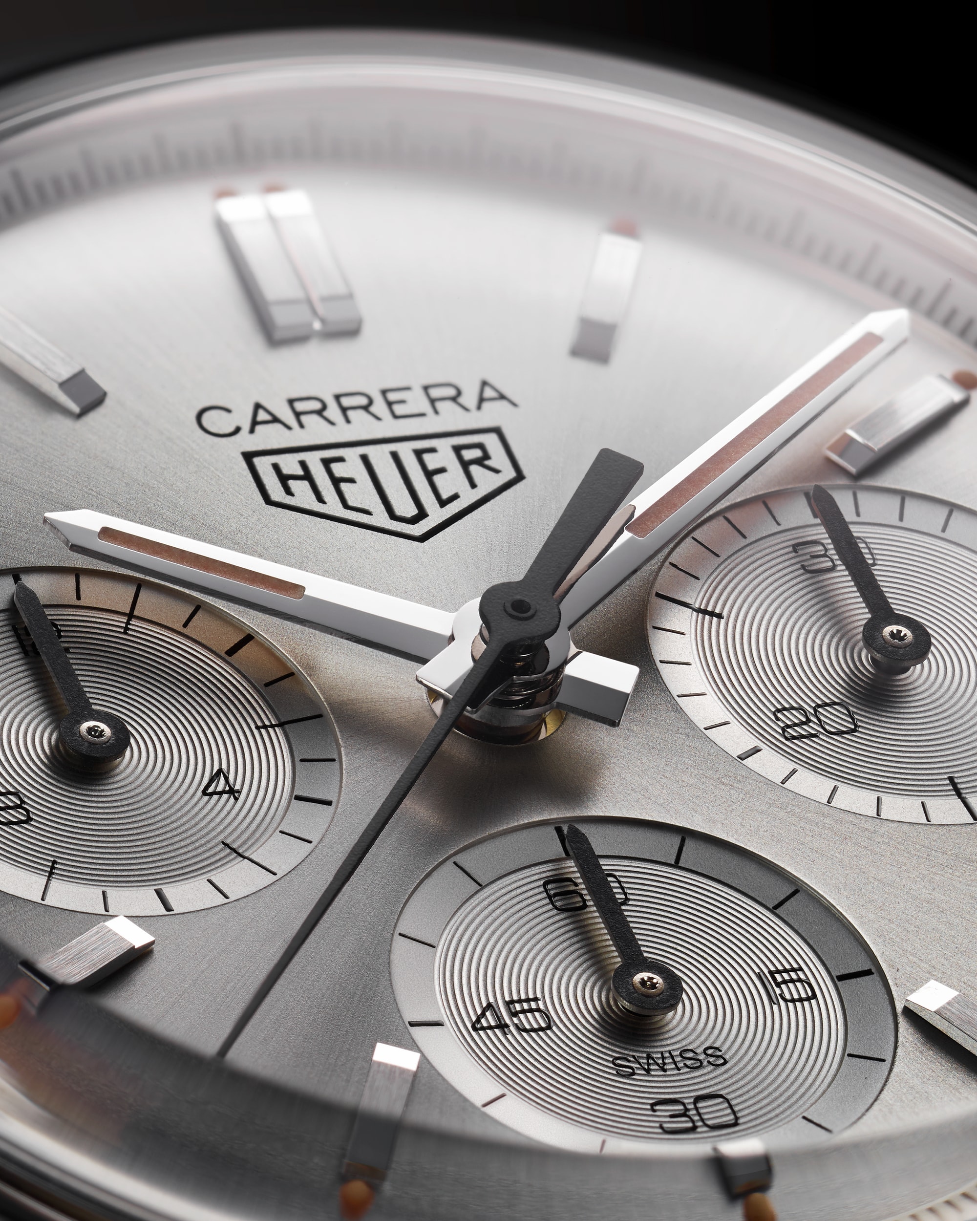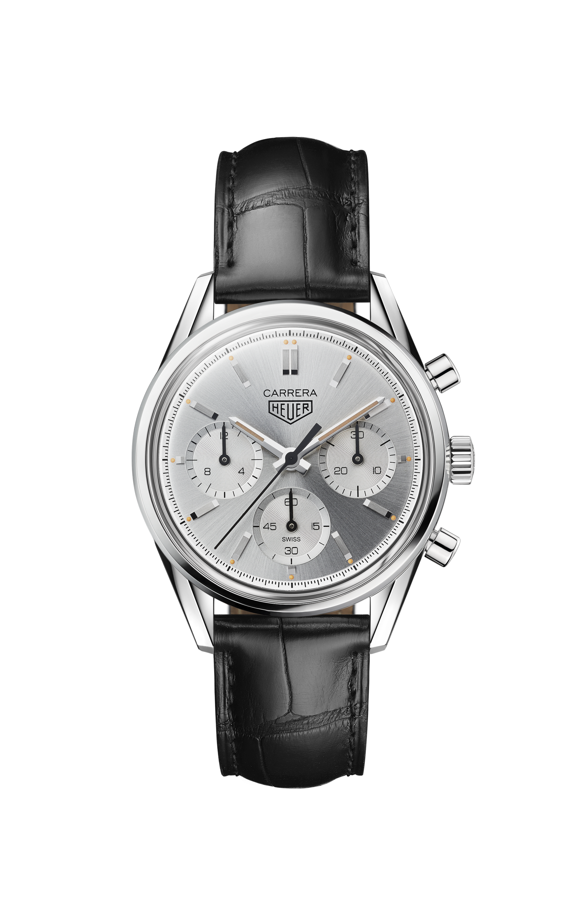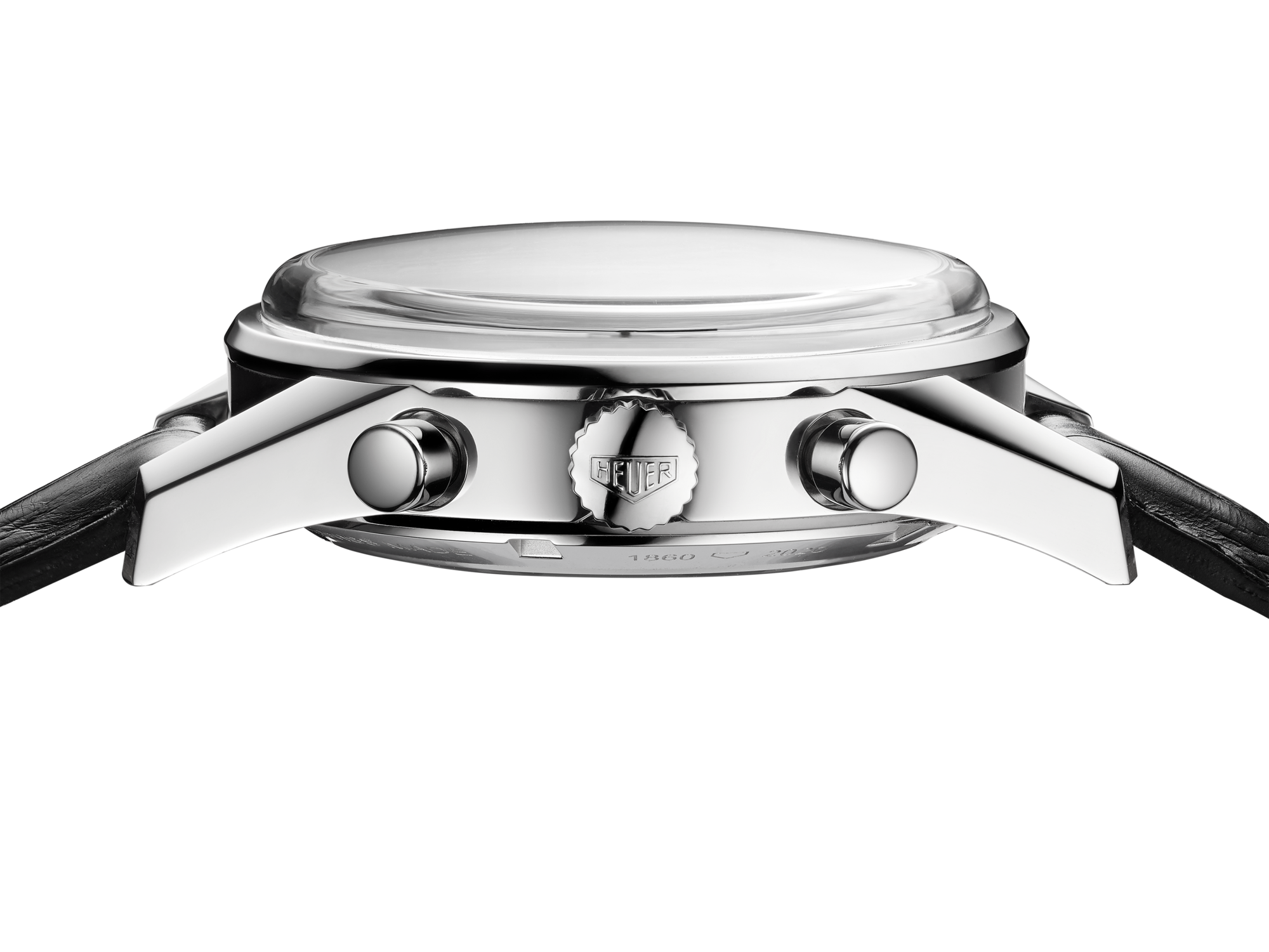 The unmistakable Carrera name and HEUER shield are printed on the dial, protected by a domed sapphire crystal that gives the watch a retro appearance reminiscent of the original Heuer Carrera.