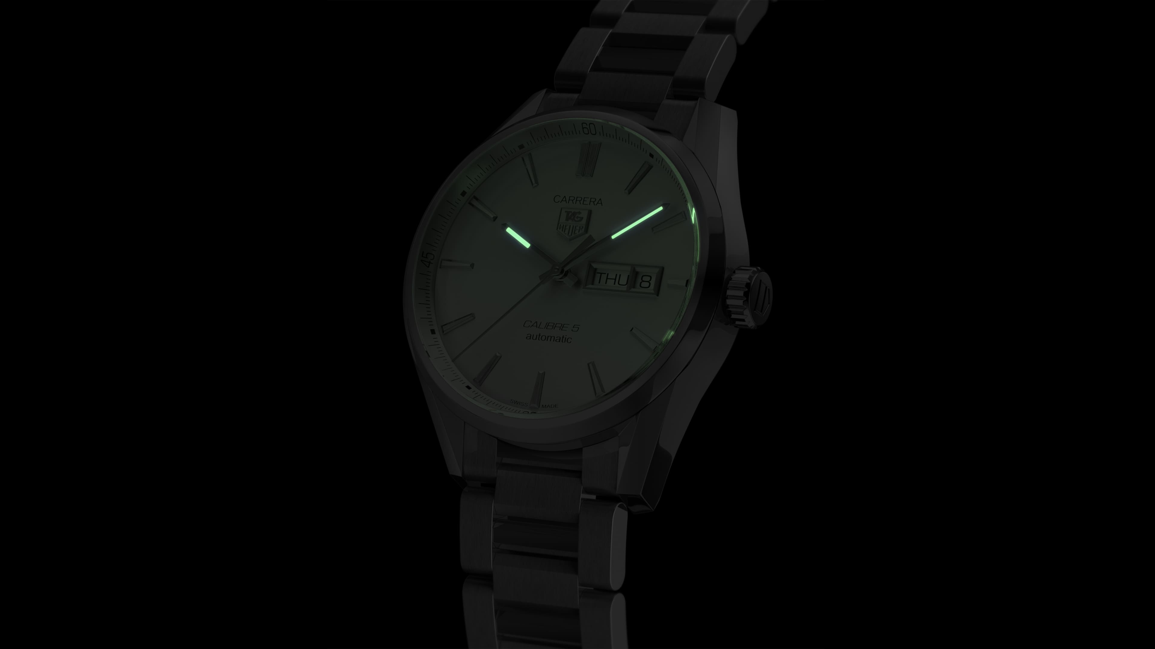 The robust Calibre 5 automatic movement is protected inside a 41mm case of solid steel, which in turn is protected by sapphire crystal front and back. Water resistance is guaranteed to 100 meters.