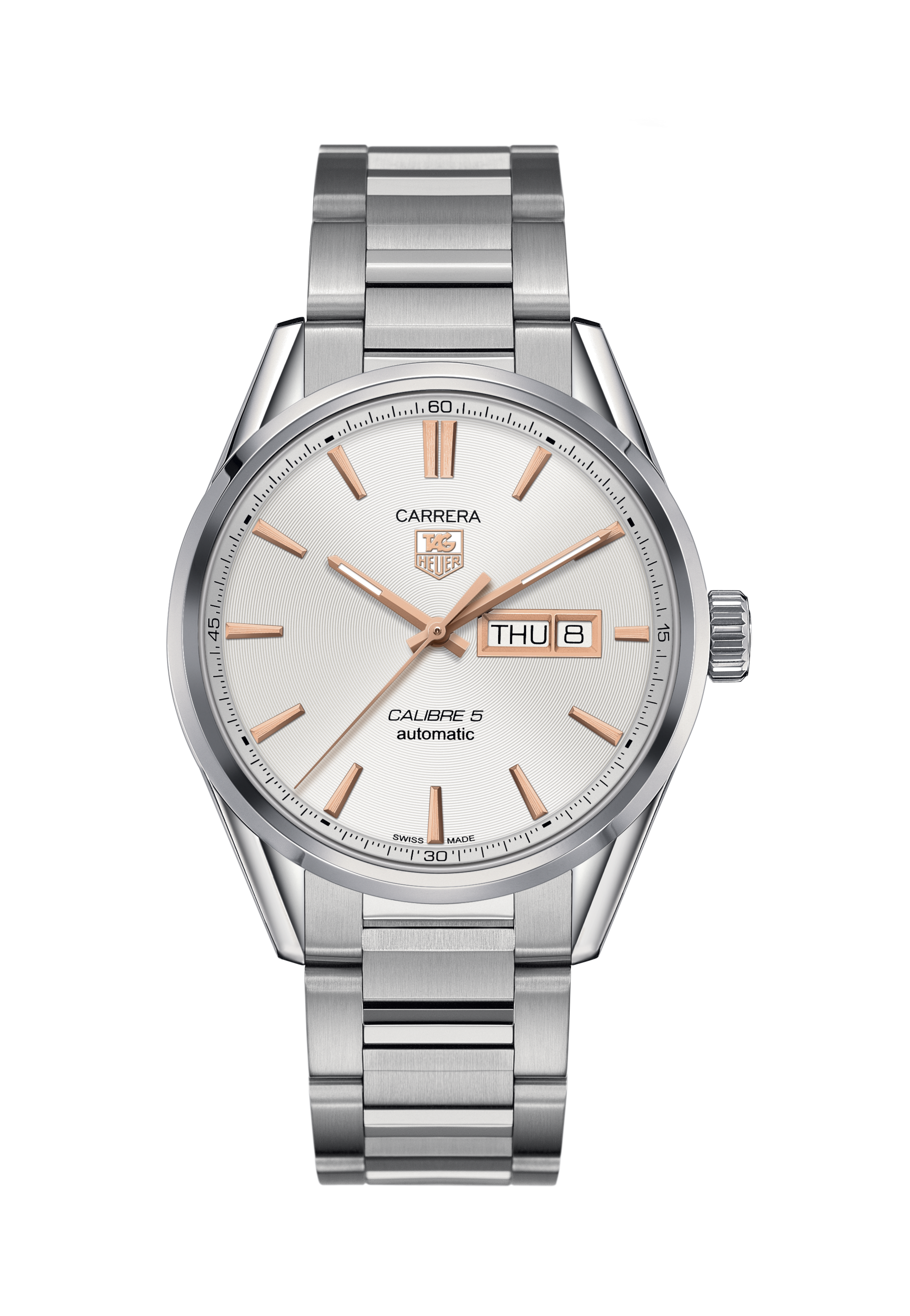 A stainless-steel watch with rose-gold plated detailing on its white dial. Powered by the robust Calibre 5 automatic movement, it comes on a steel bracelet fixed to the 41mm steel case by the iconic lugs of the TAG Heuer Carrera collection.