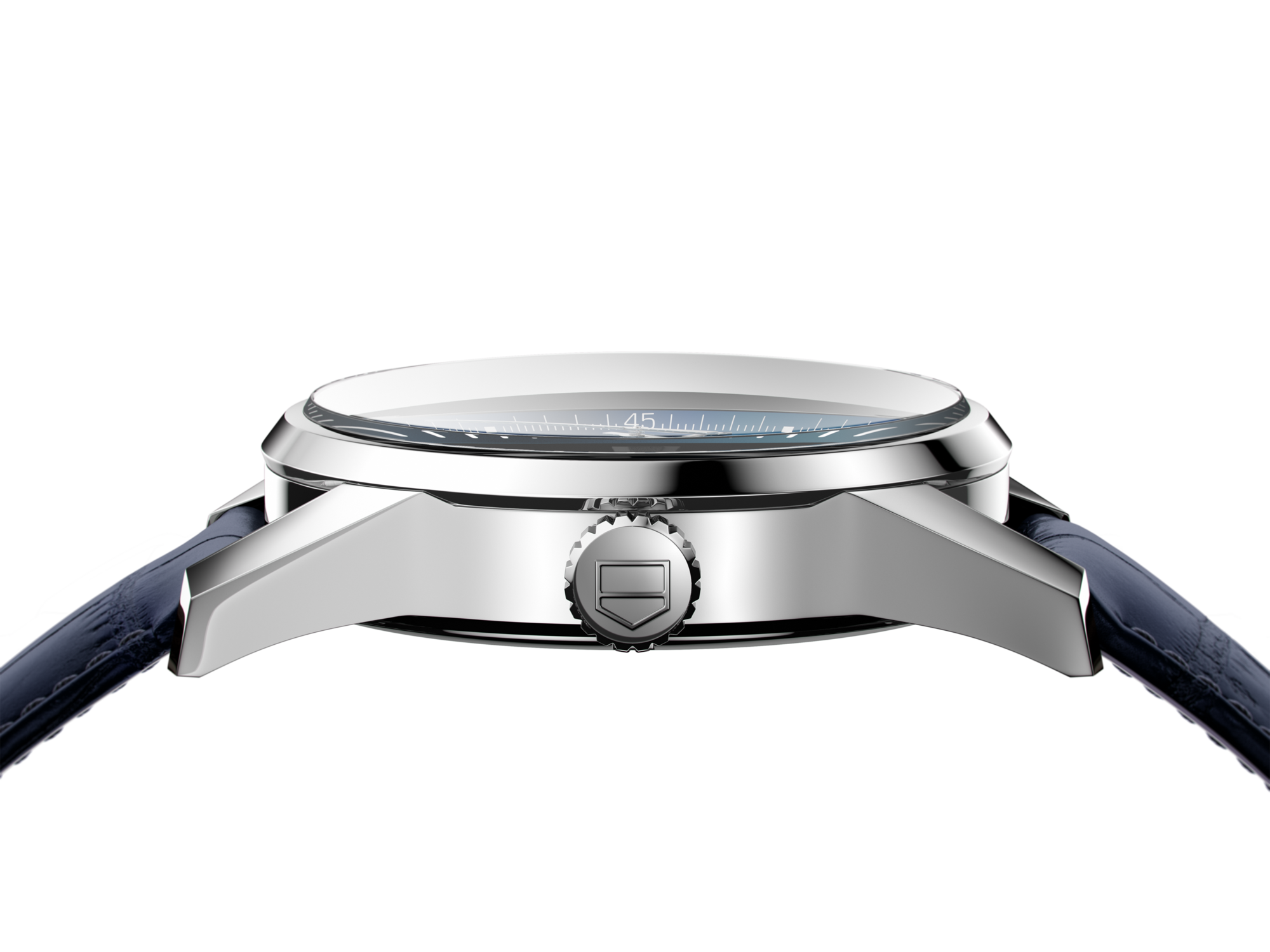 A timeless three-hand TAG Heuer Carrera with an alligator strap and a beautiful sunray blue dial. The day-date window at 3 o’clock stands out on the uncluttered, easy-to-read design.