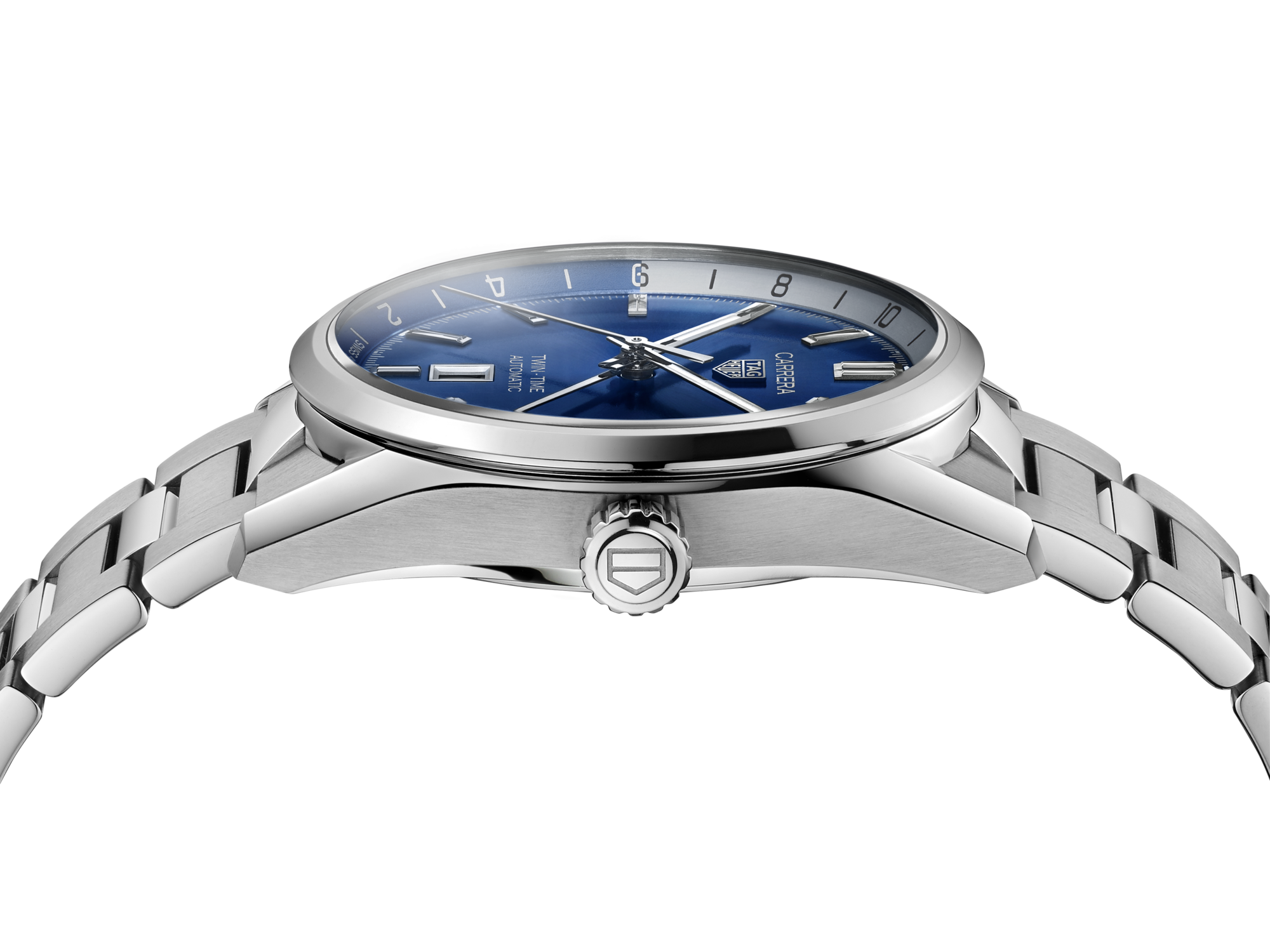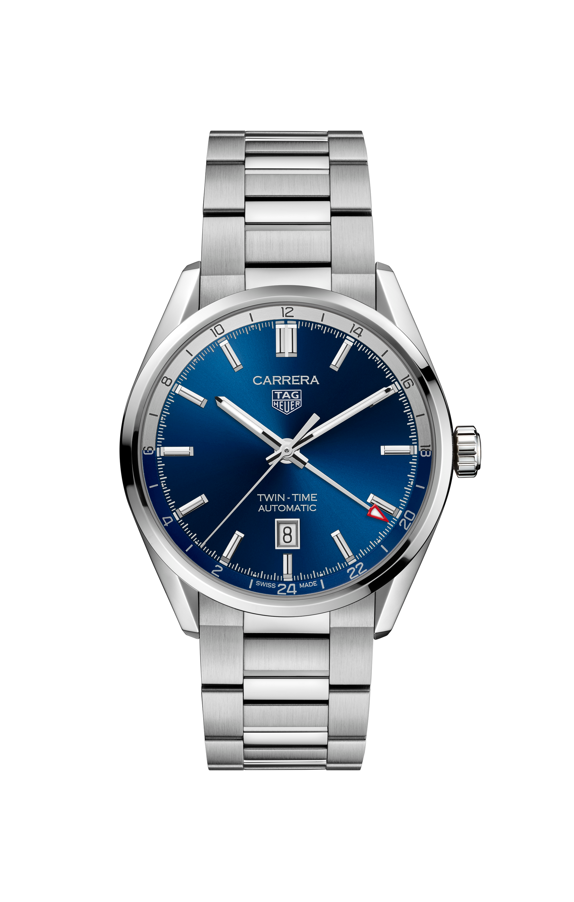 Featuring a blue sunray dial, this TAG Heuer Carrera Twin Time stands out with bolder hands and rhodium-plated indexes with Super-Luminova®.