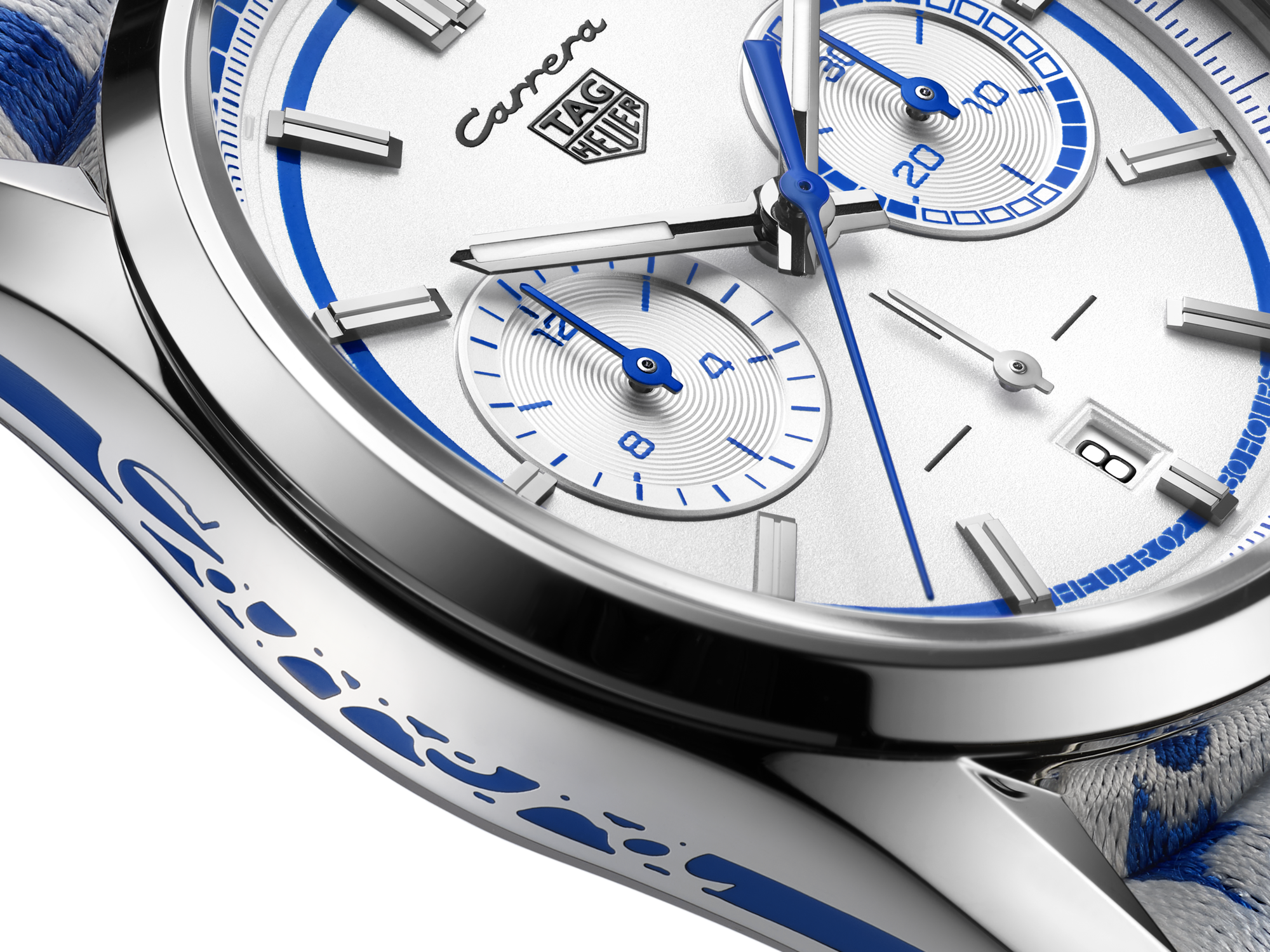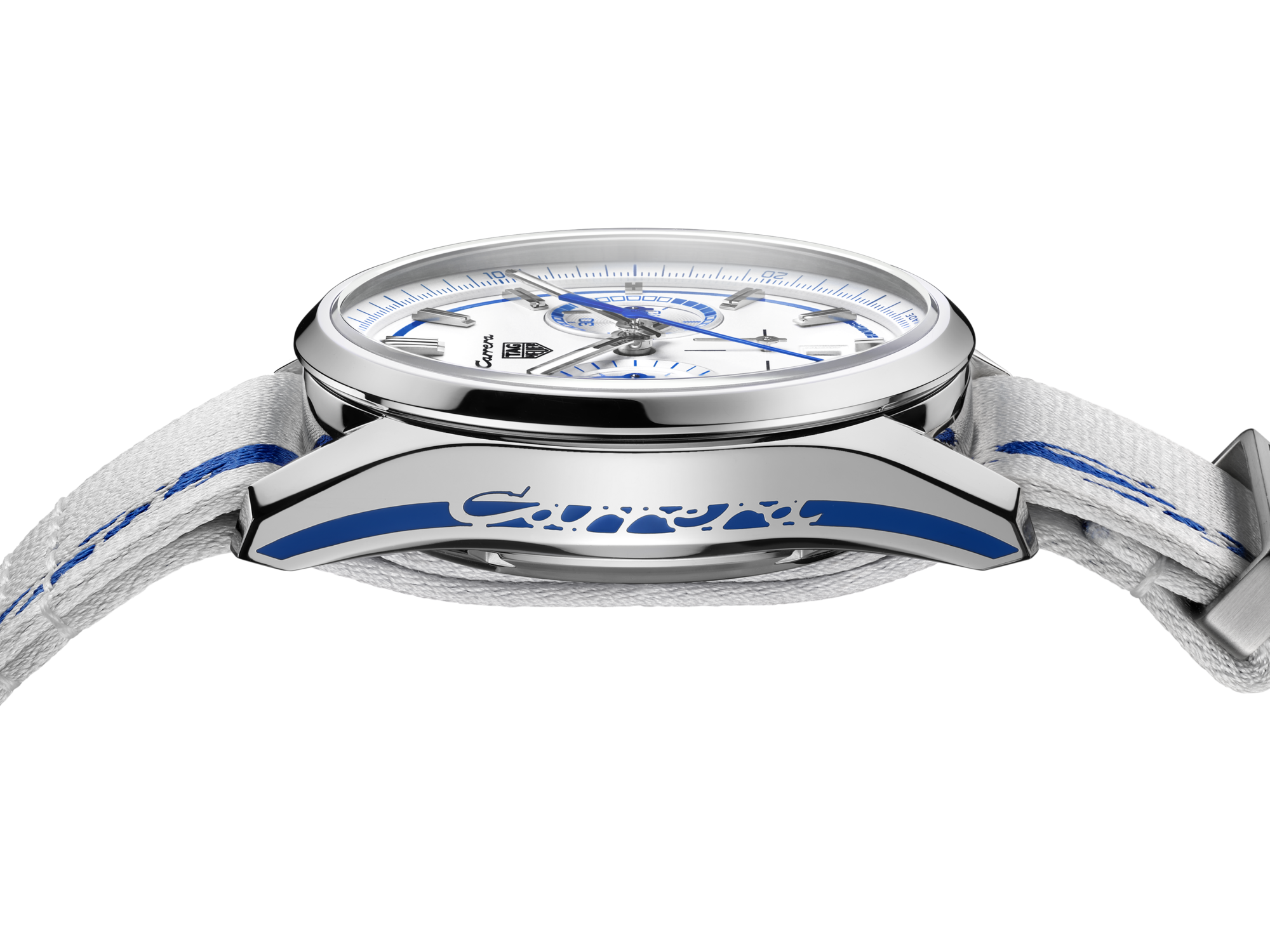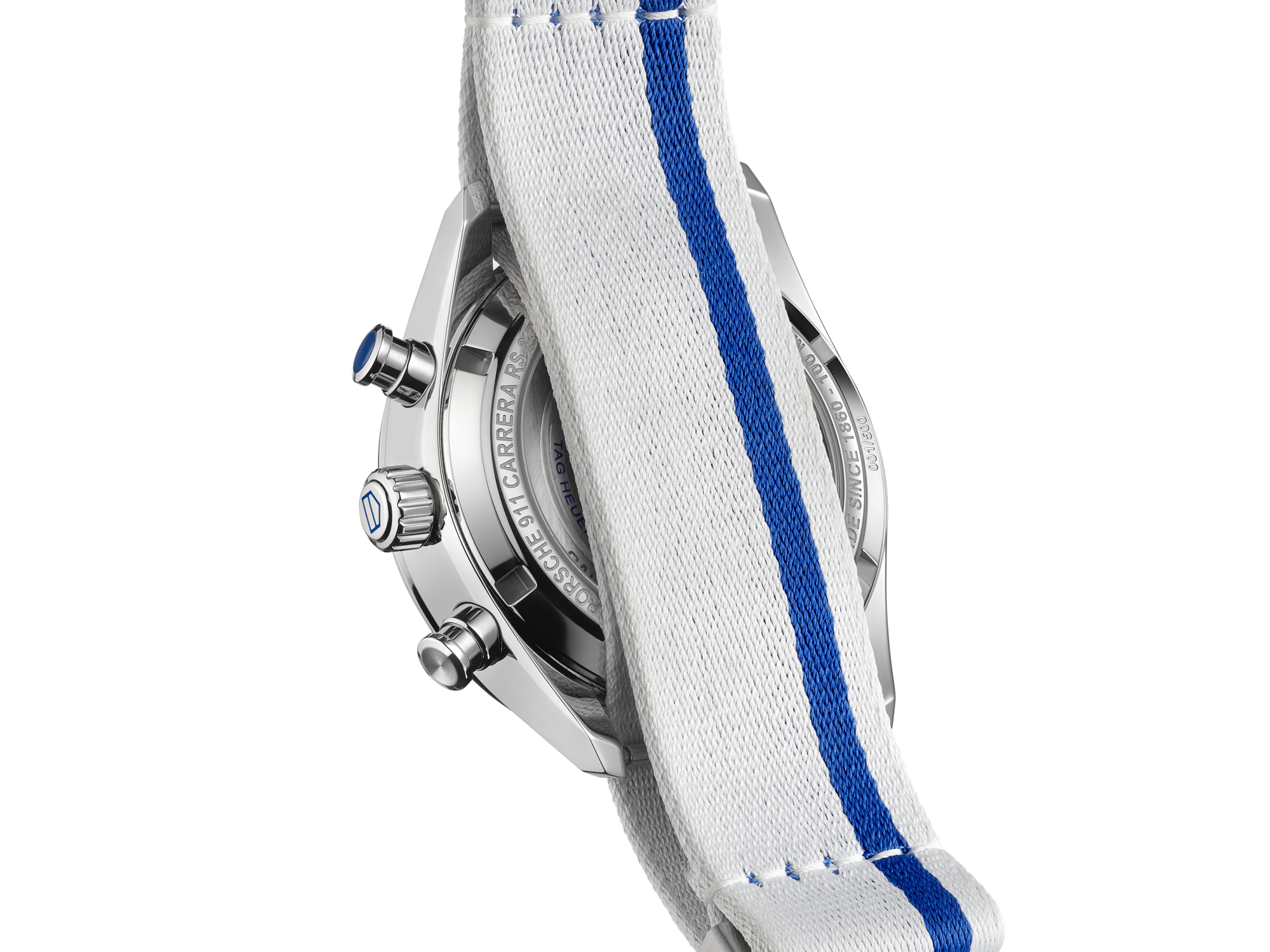 From the white and Sporty blue colour scheme to the Carrera branding on the case, strap and dial, this chronograph pays tribute to an iconic Porsche. For this special edition, the piece is presented with both the sporty fabric strap with the Porsche logo and Carrera markings, as well as an elegant steel bracelet with ergonomic H-shaped links for more formal occasions.