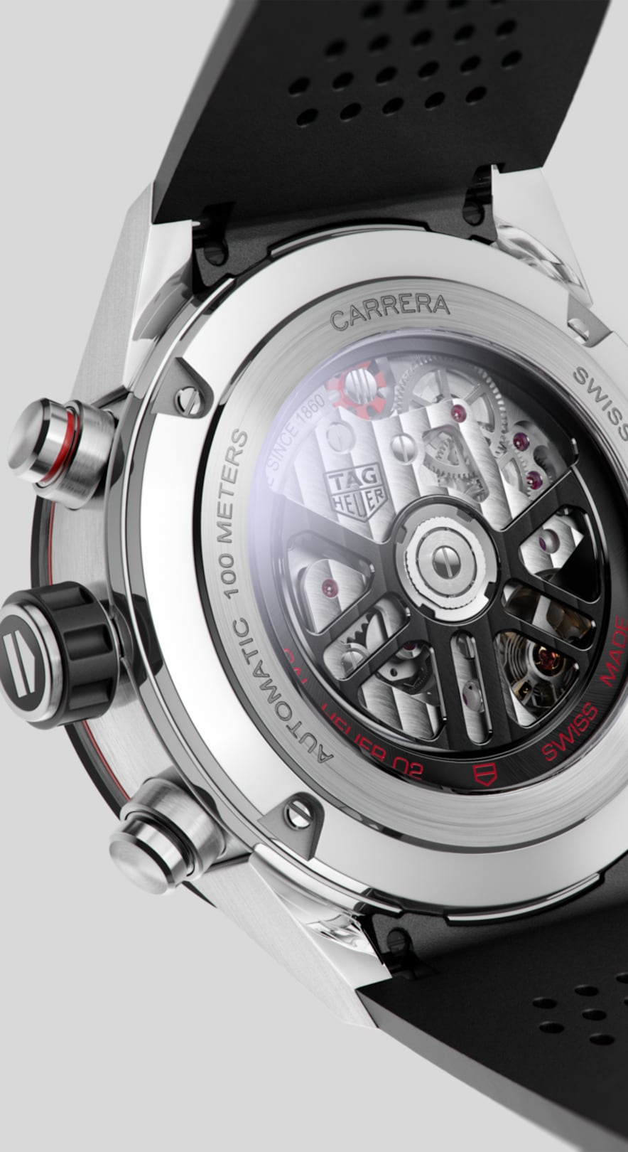 Automatic, 43 mm, Steel CBG2010.FT6143A TAG Heuer Carrera with Manufacture Mouvment Heuer 02, with steel case & lugs and a ceramic bezel. It comes with 80 hours of power reserve.The TAG Heuer Carrera’s motor-racing roots are represented by a very bold strap of black perforated rubber.