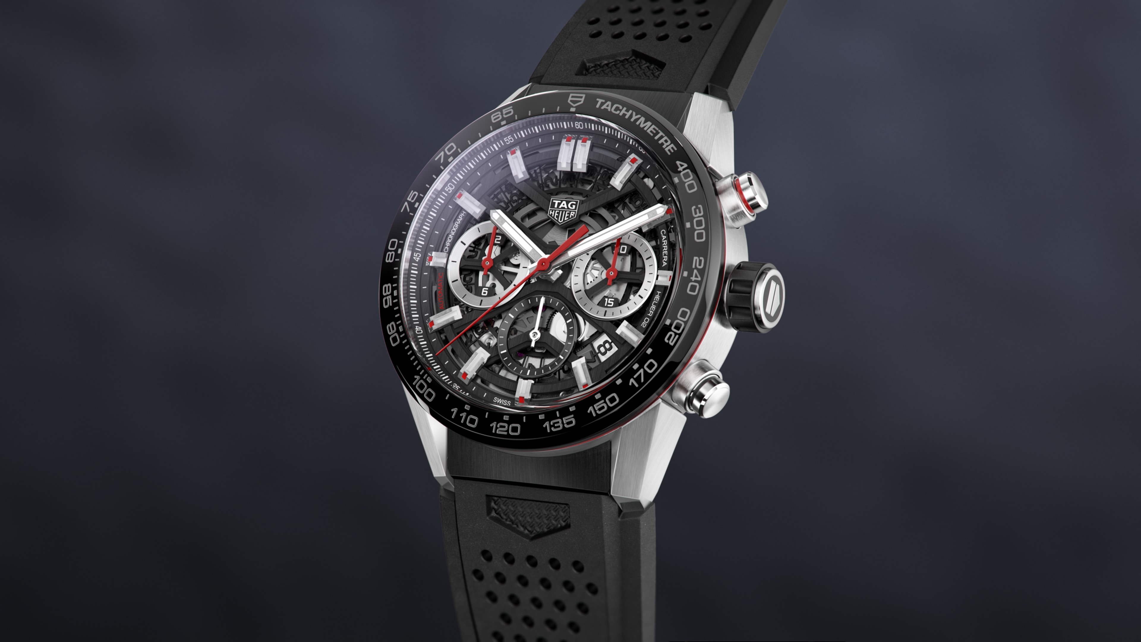 The dial design is modern and follows the traditional 3-6-9 format for its three sub-dials. Its powerhouse engine, the in-house Calibre HEUER 02, is visible through the intricately skeletonized black dial and sapphire case back.