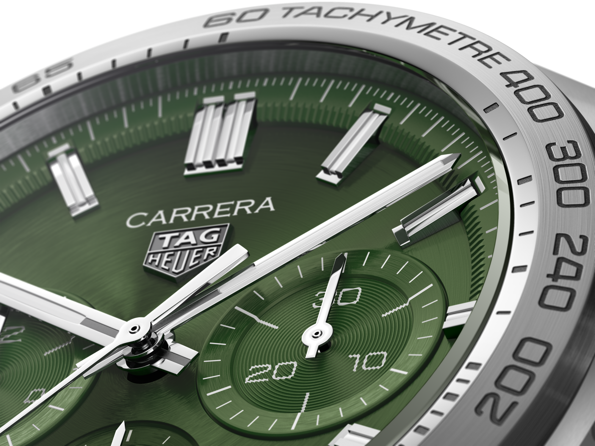 Automatic, 44 mm, Steel CBN2A10.BA0643A TAG Heuer Carrera chronograph with all the prestige of its motor-racing heritage. With 44-mm fine-brushed and polished steel case, our manufacture Heuer 02 automatic movement and trendy green brushed dial, punctuated with a second indicator and two green chronograph counters, makes for unbeatable functional style.