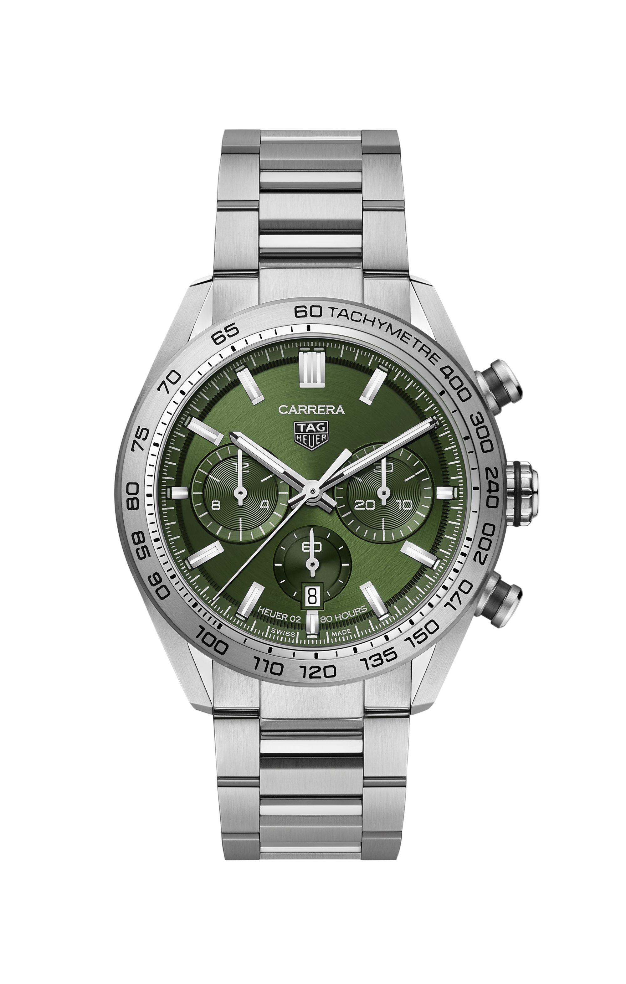 A TAG Heuer Carrera chronograph with all the prestige of its motor-racing heritage. With 44-mm fine-brushed and polished steel case, our manufacture Heuer 02 automatic movement and trendy green brushed dial, punctuated with a second indicator and two green chronograph counters, makes for unbeatable functional style.