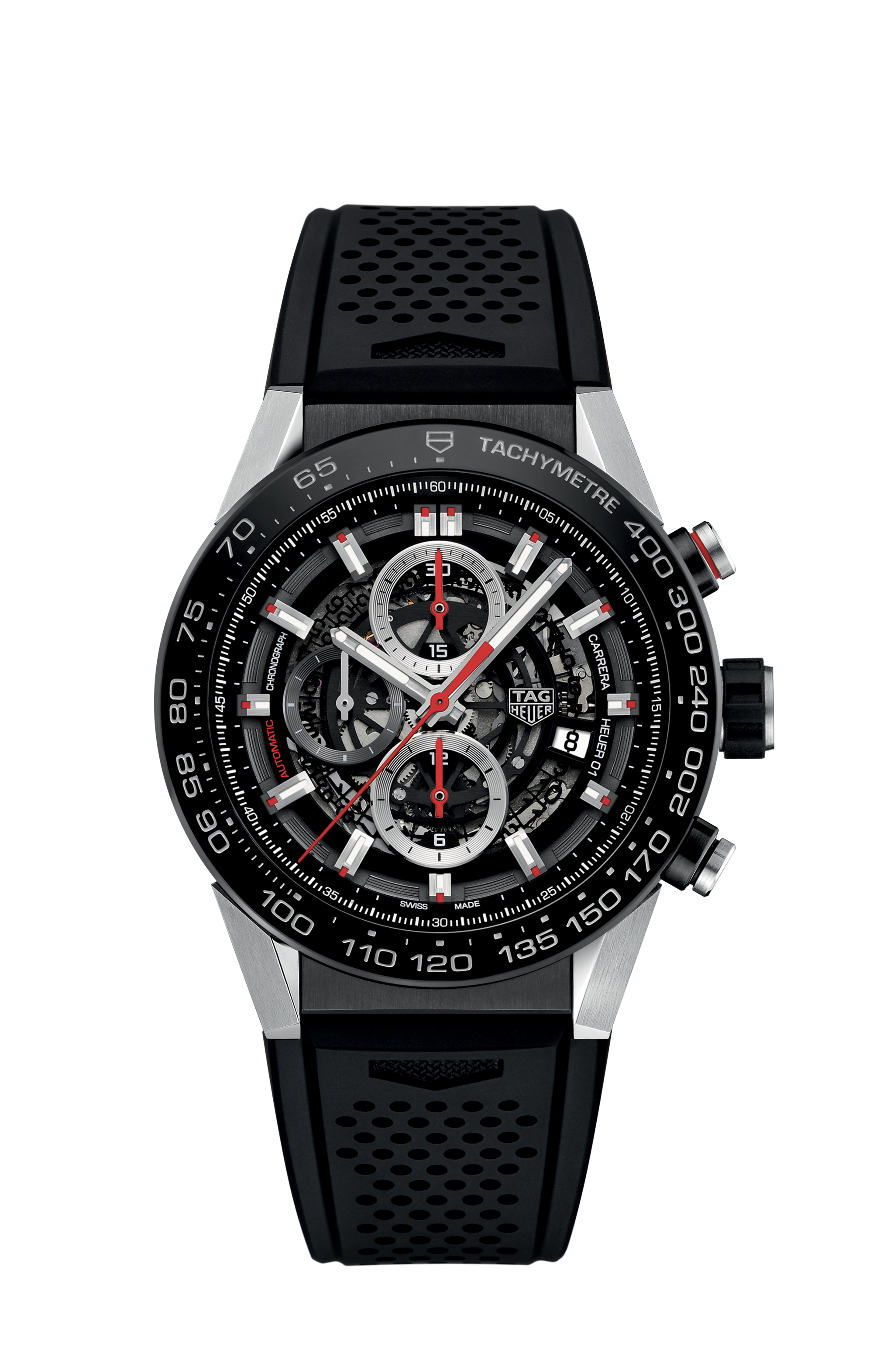 Swiss-made, this bold TAG Heuer Carrera is an aesthetic 45 mm watch. This model features a Steel Black PVD case and a Calibre Heuer 01 Automatic movement.