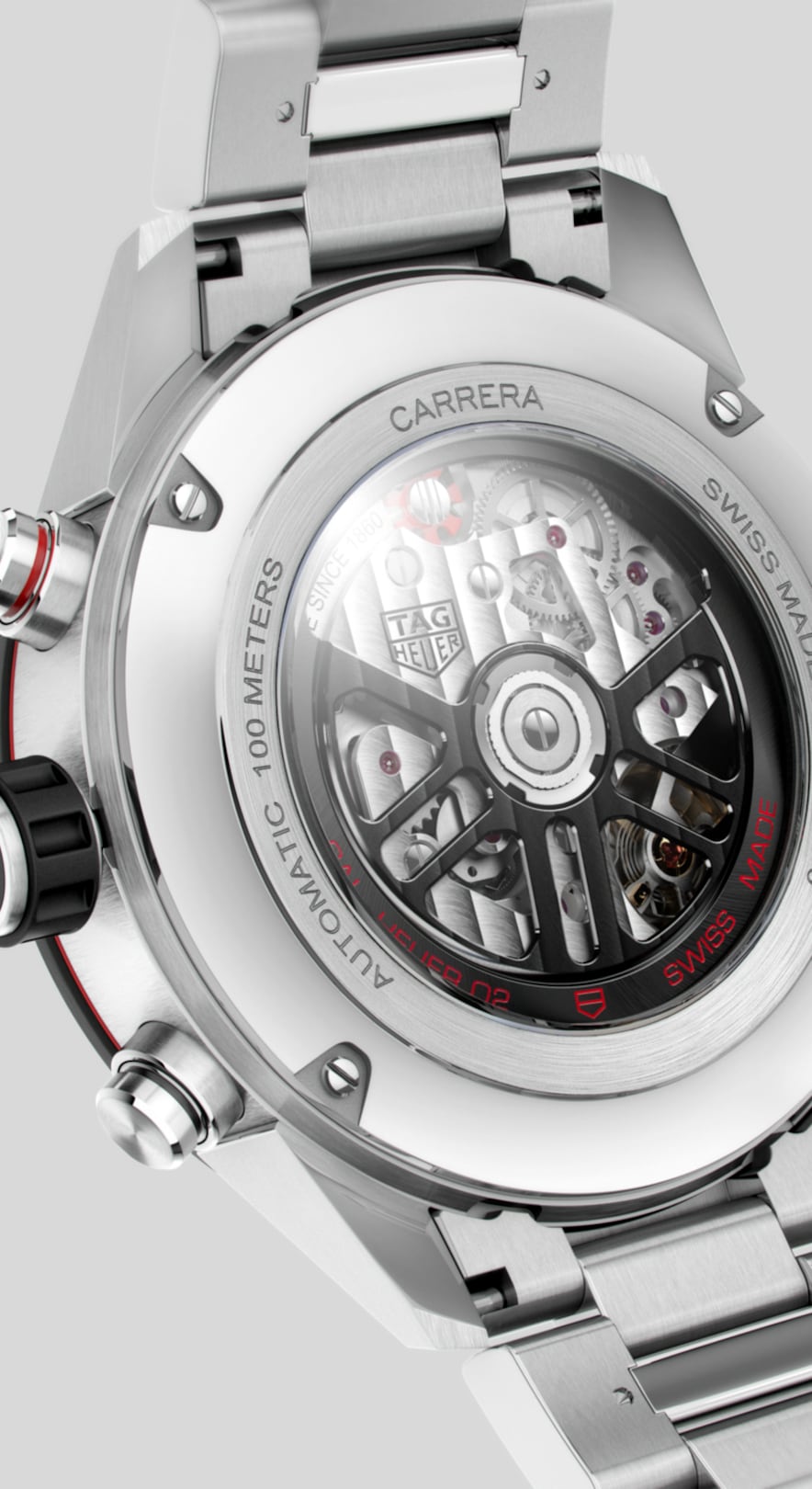 The silver-toned indexes and the minute and hour hands are coated with Super-LumiNova® for enhanced readability. The skeletonized dial reveals the chronograph’s powerful engine, the Manufacture Heuer 02 movement.