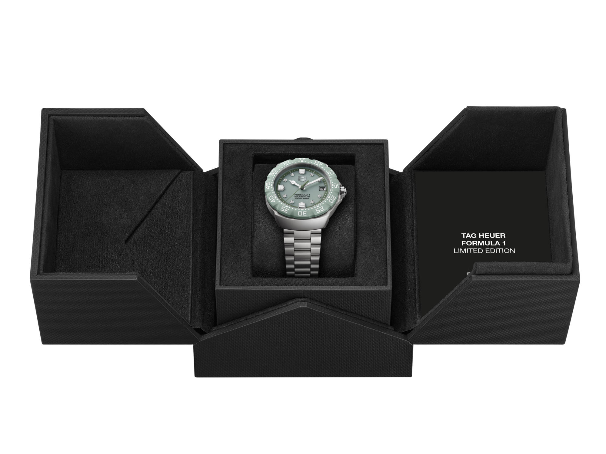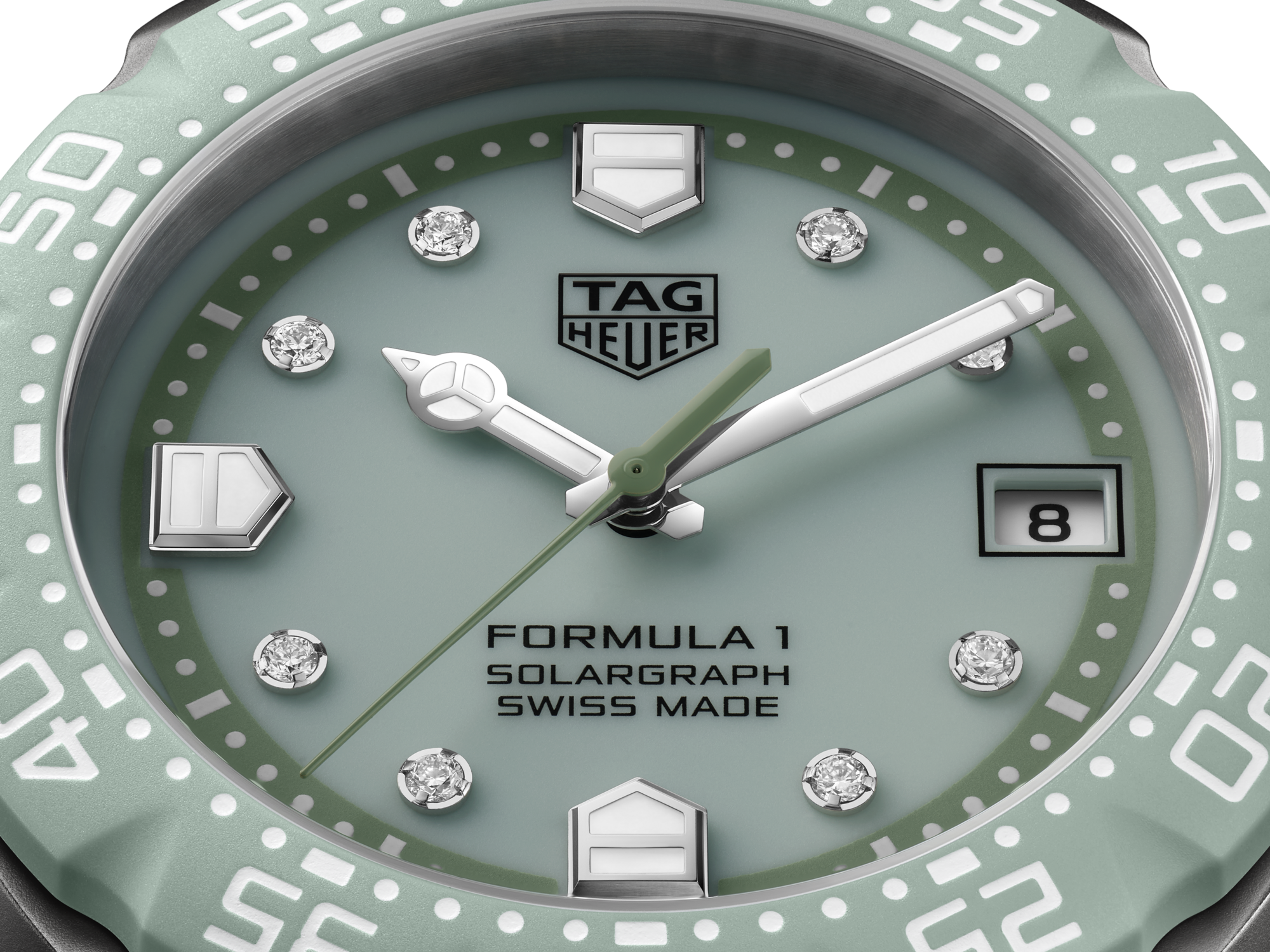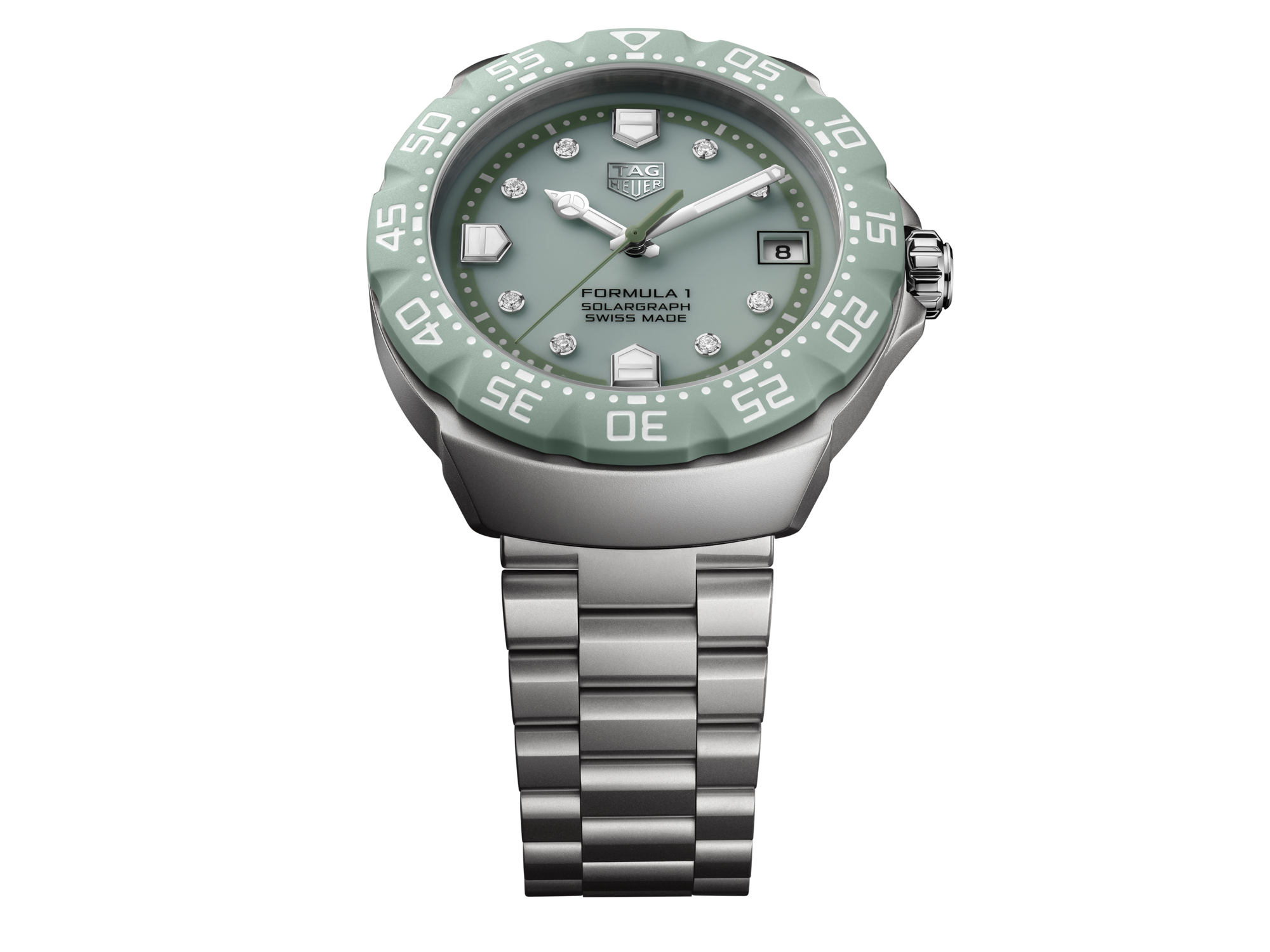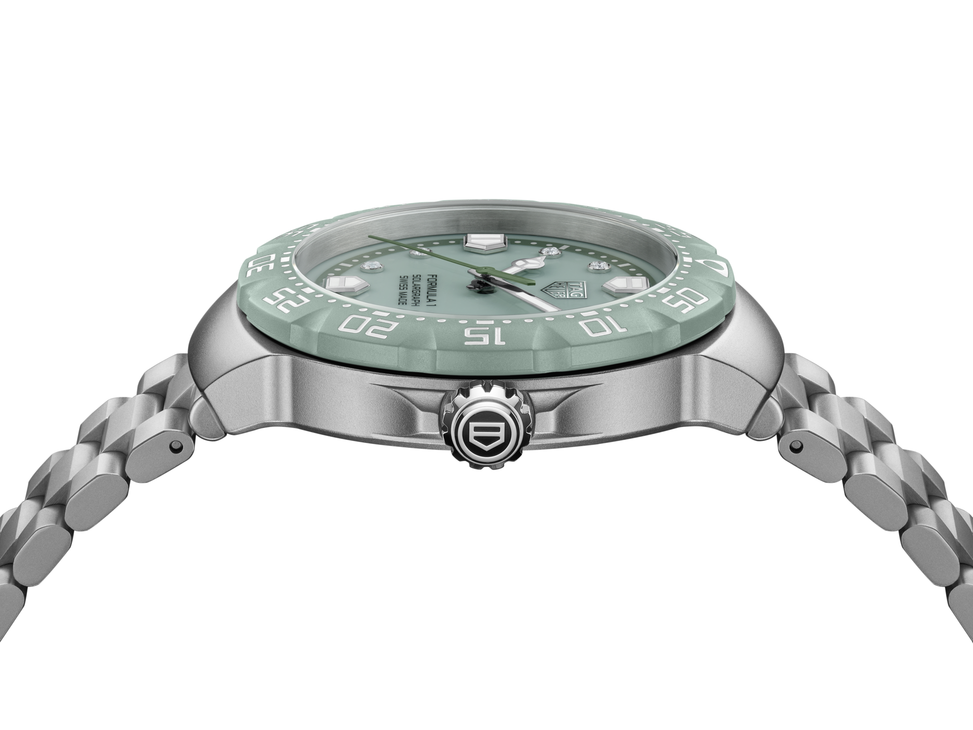 This TAG Heuer Formula 1 Solargraph limited edition timepiece offers a bold take on the collection's functional design. Crafted in sandblasted stainless steel, the 38 mm case and bracelet combine durability with everyday comfort. The pastel green dial is enhanced by 8 circular diamond-set indexes (0.076 ct, Color H, Clarity SI) and signature shield-shaped markers for excellent legibility. A bi-directional TH-Polylight bezel reinforces the timepiece's functional identity. Powered by the Solargraph Calibre TH50-00, it converts light into energy to deliver reliable precision and extended autonomy.