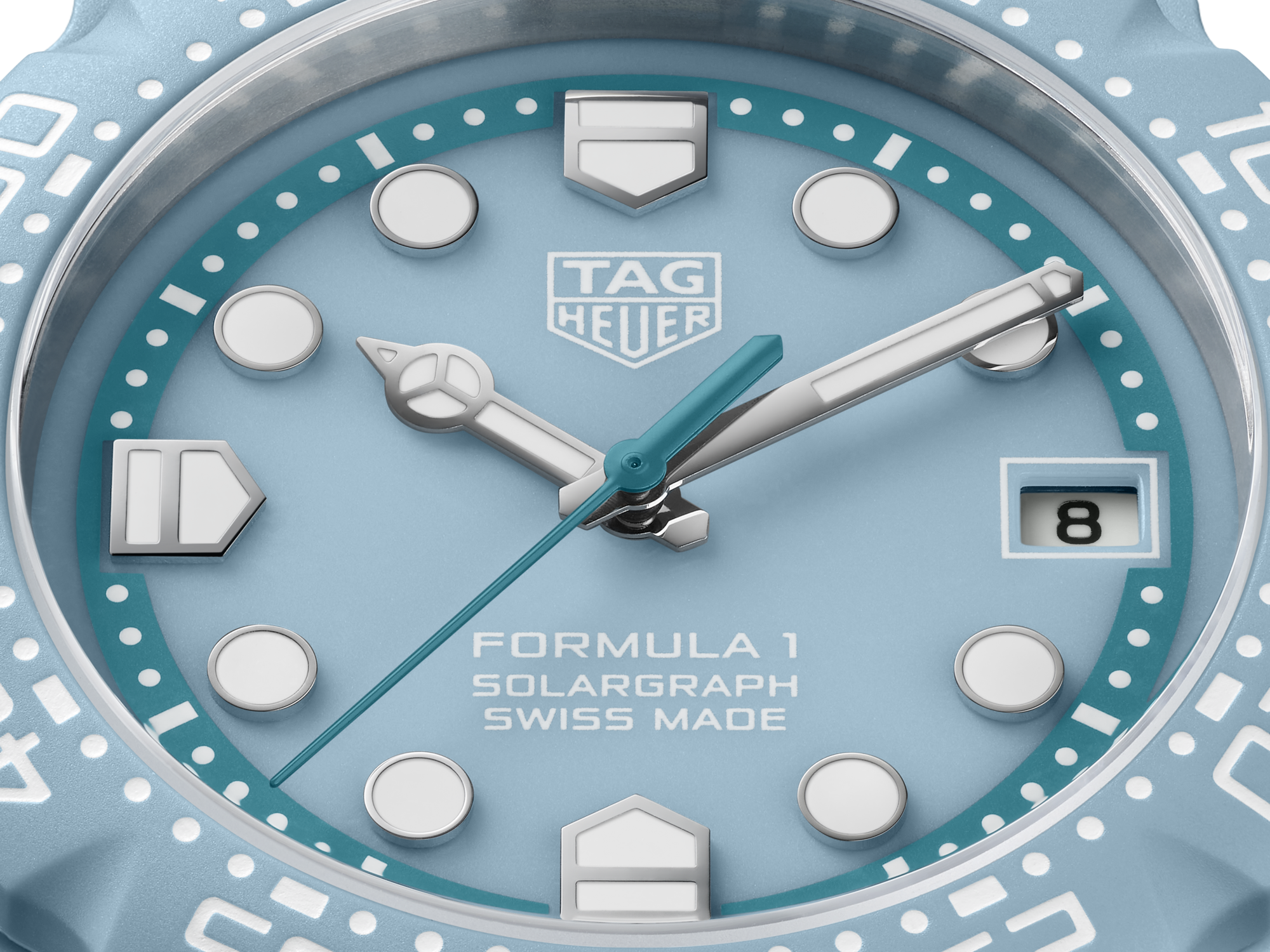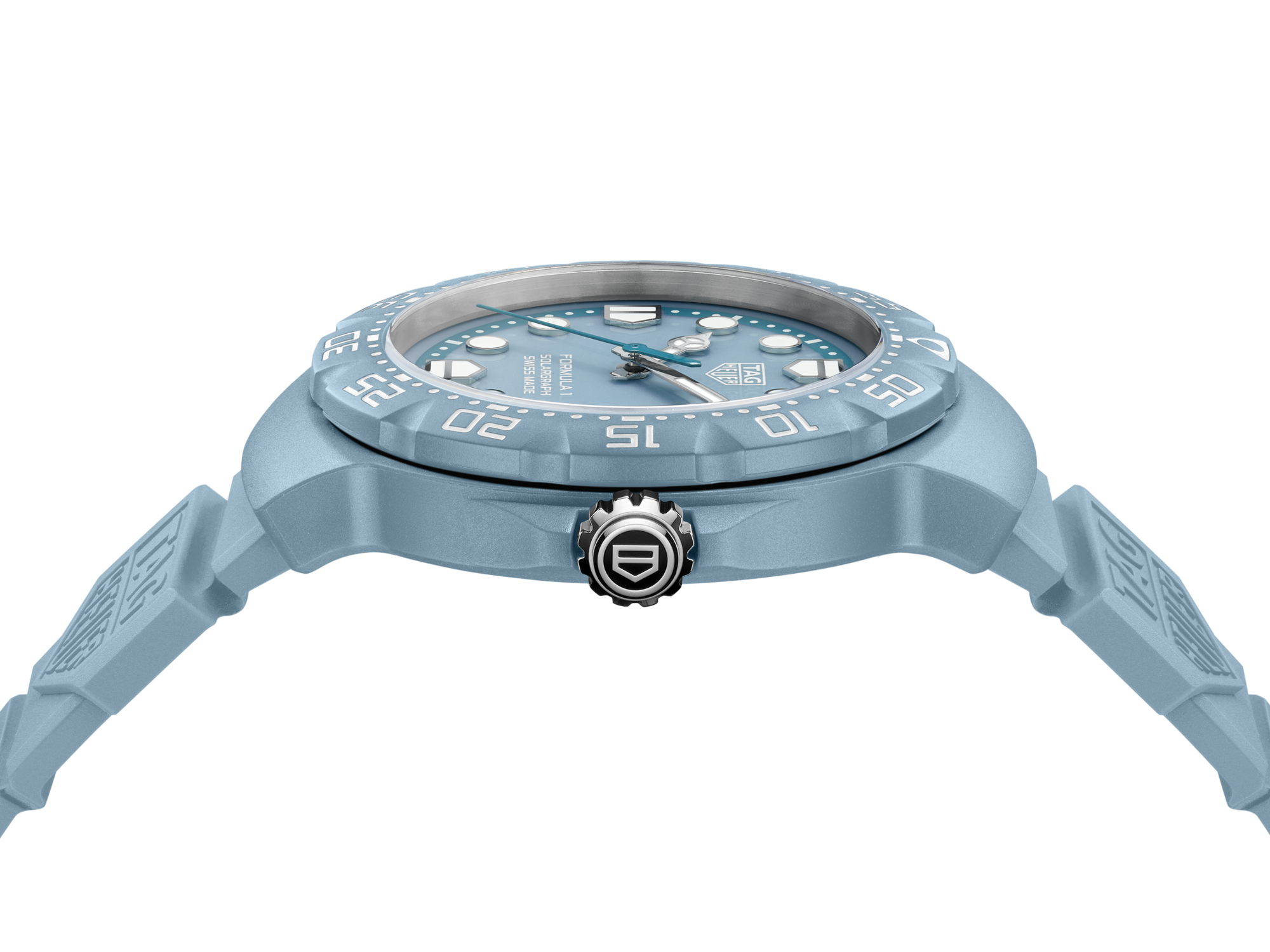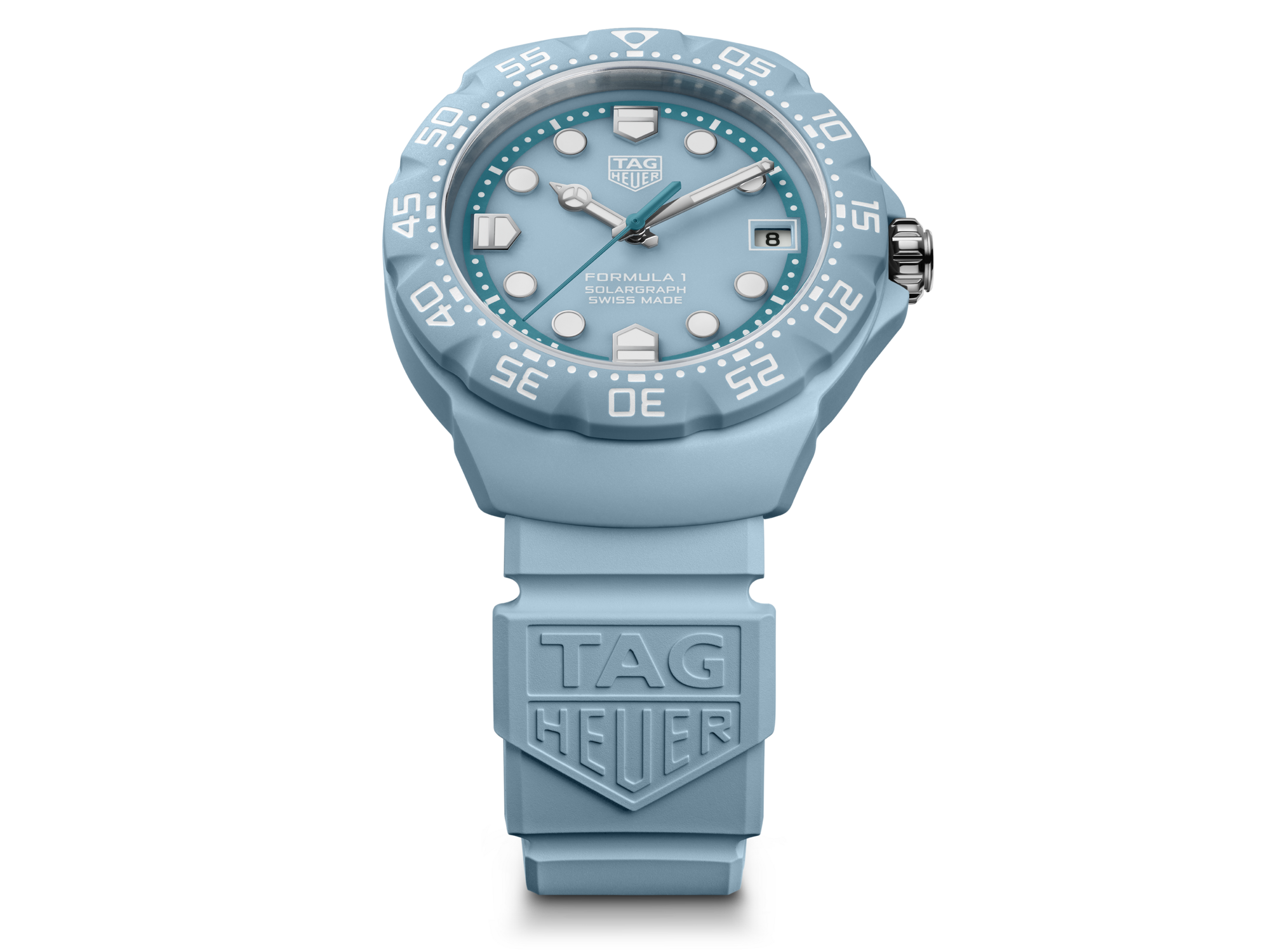 The TAG Heuer Formula 1 Solargraph timepiece blends bold color with lightweight performance. Its TH-Polylight 38 mm case ensures durability while remaining comfortable for everyday wear. The pastel blue dial features rhodium-plated applied indexes and signature shield-shaped markers for excellent legibility. A bi-directional TH-Polylight bezel reinforces the collection’s dynamic design. Inside, the Solargraph Calibre TH50-00 converts natural and artificial light into energy, delivering reliable precision and extended autonomy with minimal maintenance.