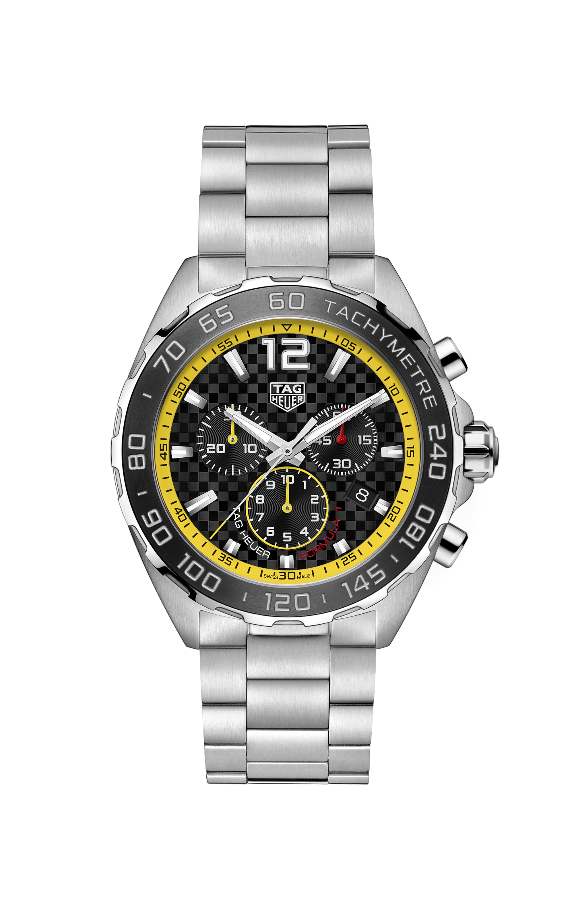 Sleek, fast, daring, this motor-sports icon seizes the lead with racy carbon fiber-textured midnight dial and 60 second / minute scale flange and central hand tip in bright contrast yellow. A watch that keeps the pilot’s hand steady on the wheel and the automobile in front.