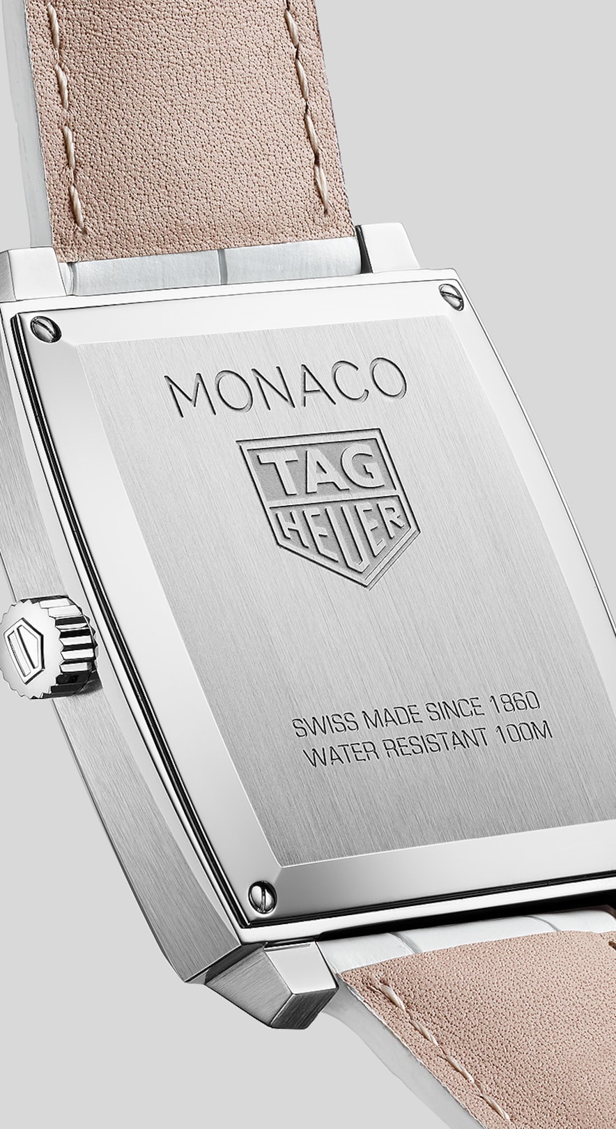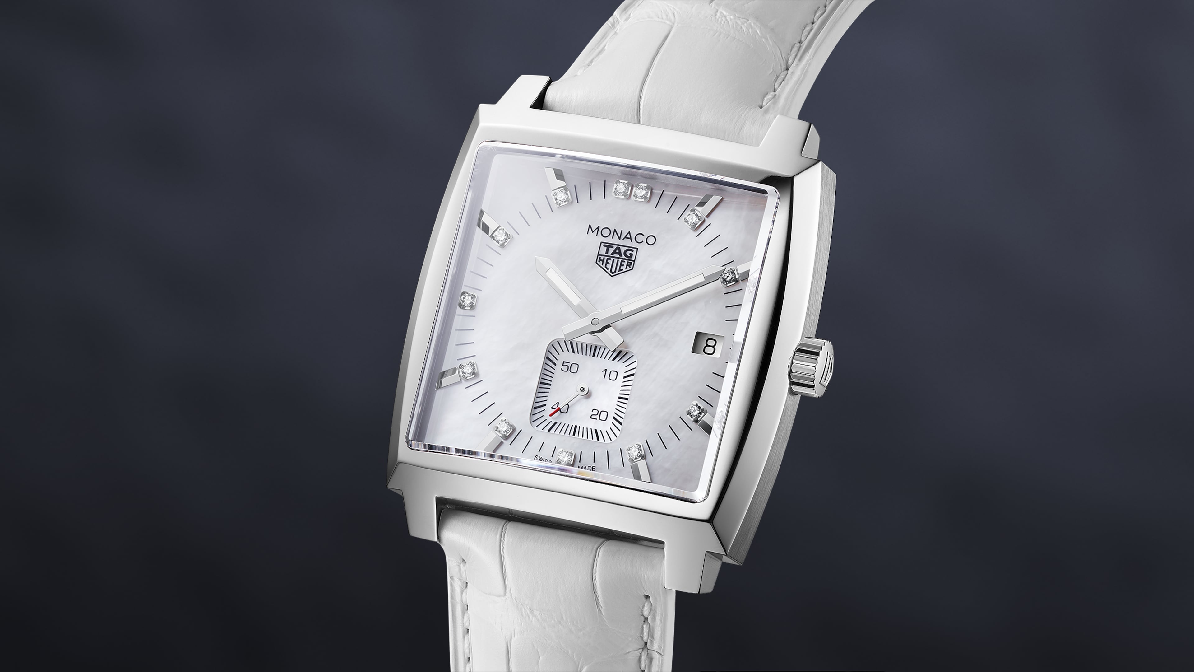 A serious piece of head-turning eye candy: 12 white diamonds on a white mother-of-pearl dial and an on-trend, very feminine strap in white alligator. The distinctive 37mm square-shaped case is in polished steel, as is the crown at 3 o'clock. The most glamorous Monaco yet.