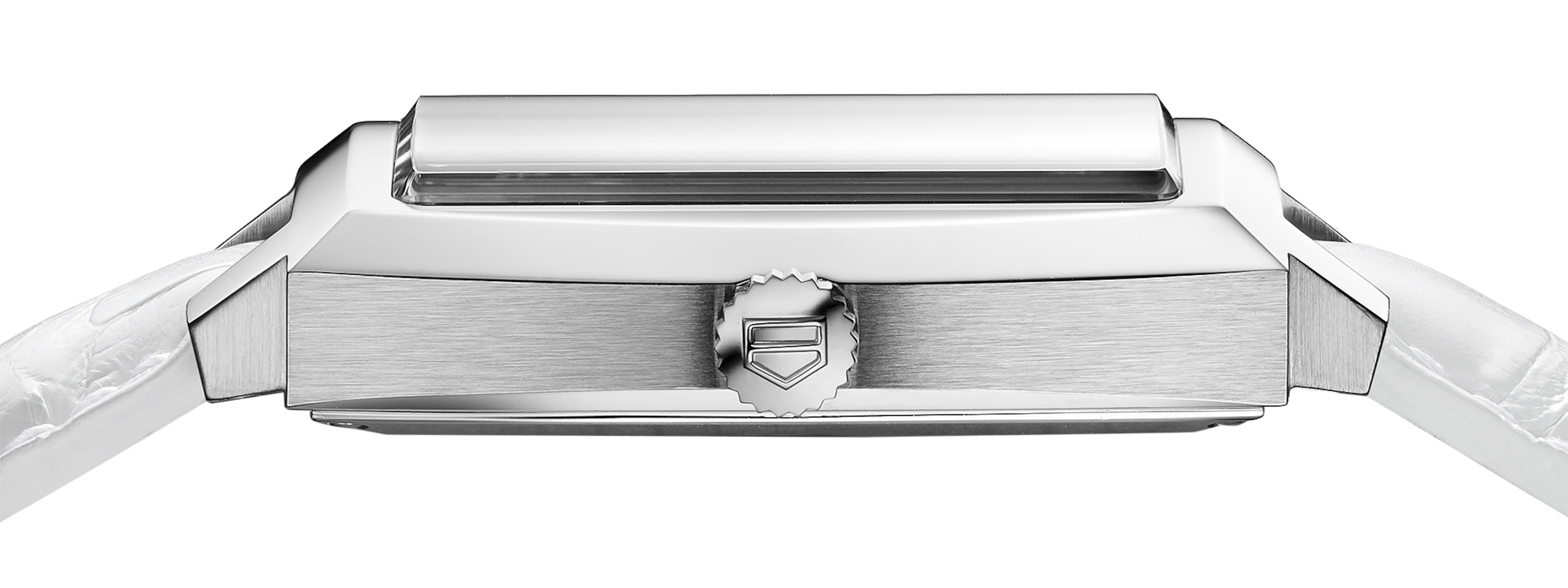 Quartz, 37 mm, Steel WAW131B.FC6247A serious piece of head-turning eye candy: 12 white diamonds on a white mother-of-pearl dial and an on-trend, very feminine strap in white alligator. The distinctive 37mm square-shaped case is in polished steel, as is the crown at 3 o'clock. The most glamorous Monaco yet.