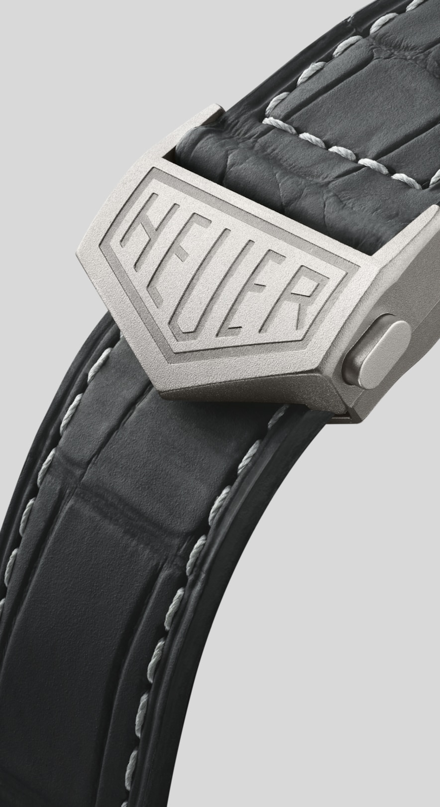 A vivid and gleaming silver-coloured dial which perfectly complements the titanium case. The horizontal markers evoke the watch's legendary origins, while the red highlights add a dash of cool.