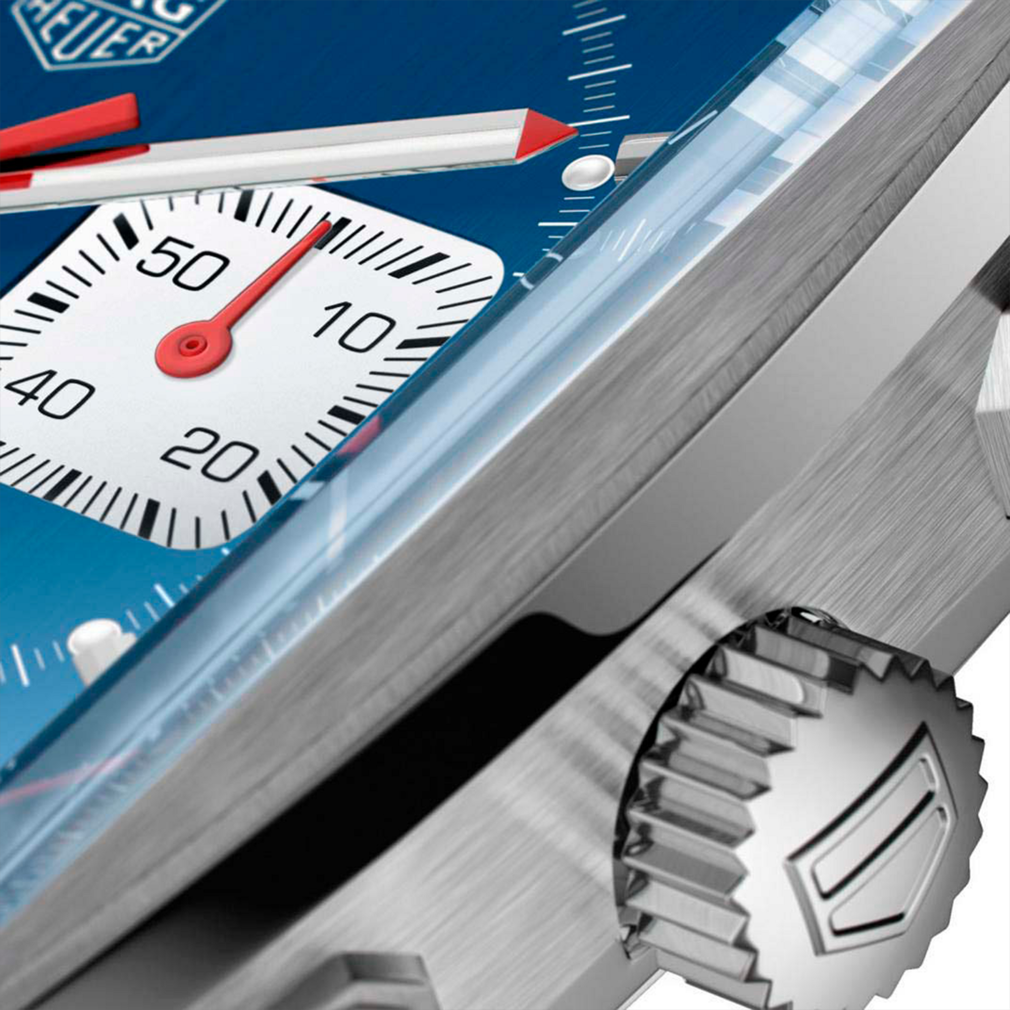 A modern incarnation of the watch made robust by Steve McQueen, with a TAG Heuer Calibre 12 automatic movement under the hood and a metallic starburst blue dial as boldly cool as the original.