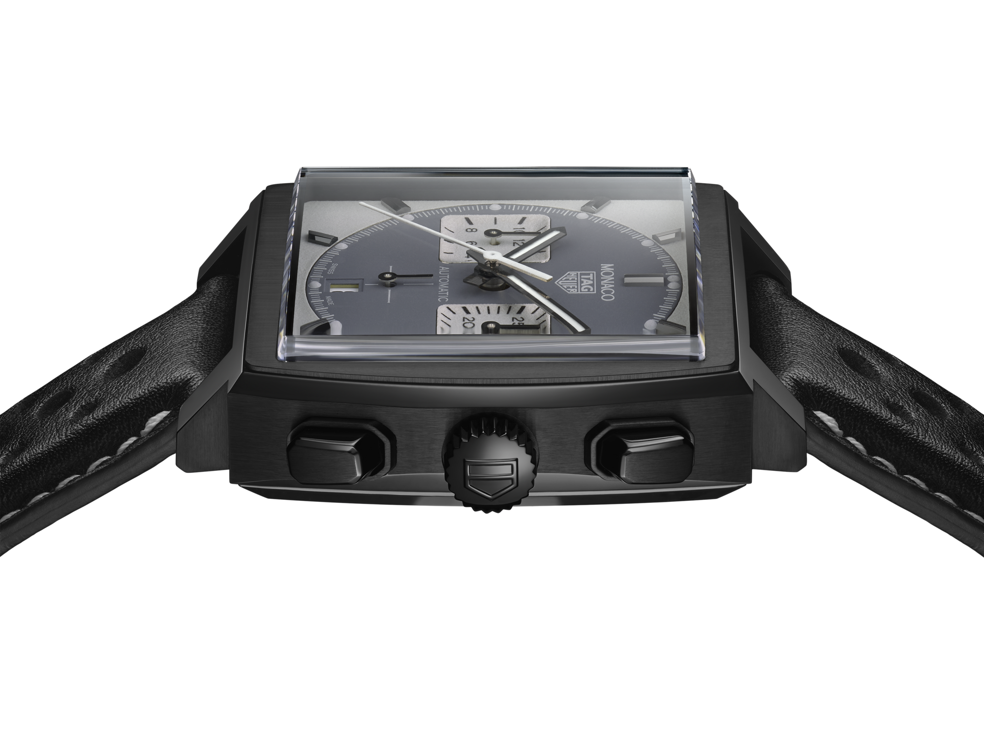 Water-resistant to 100 metres, the black DLC-coated titanium grade 5 case houses the expert Calibre Heuer 02, visible through the sapphire case back.