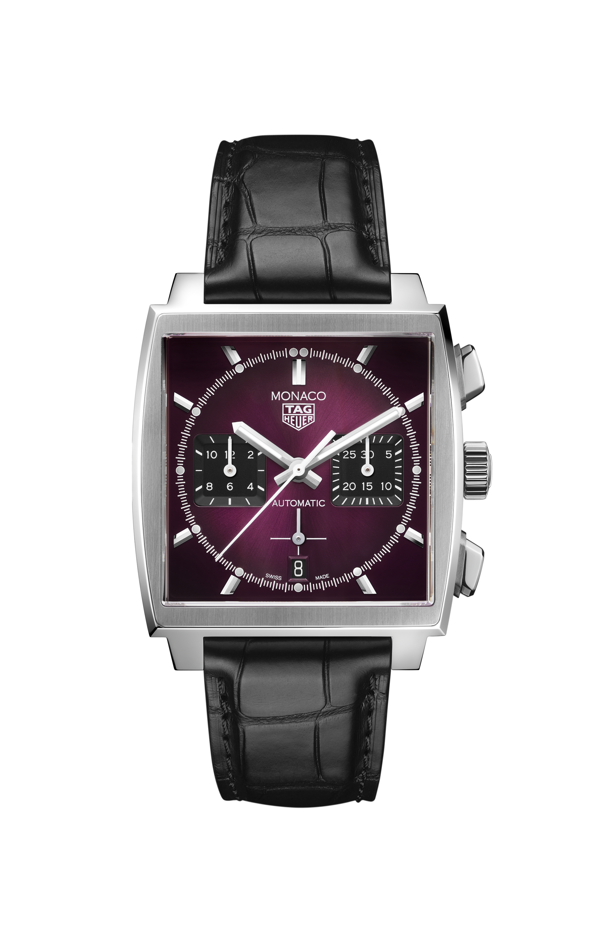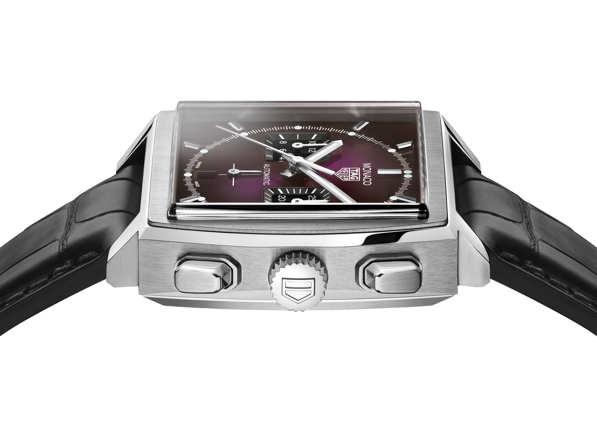 A rebellious take on the iconic TAG Heuer Monaco, a limited edition with a daring smokey purple sunray brushed dial and contrasting black subdials. Fiercely powered by the automatic manufacture calibre Heuer 02 movement, and limited to 500 pieces.