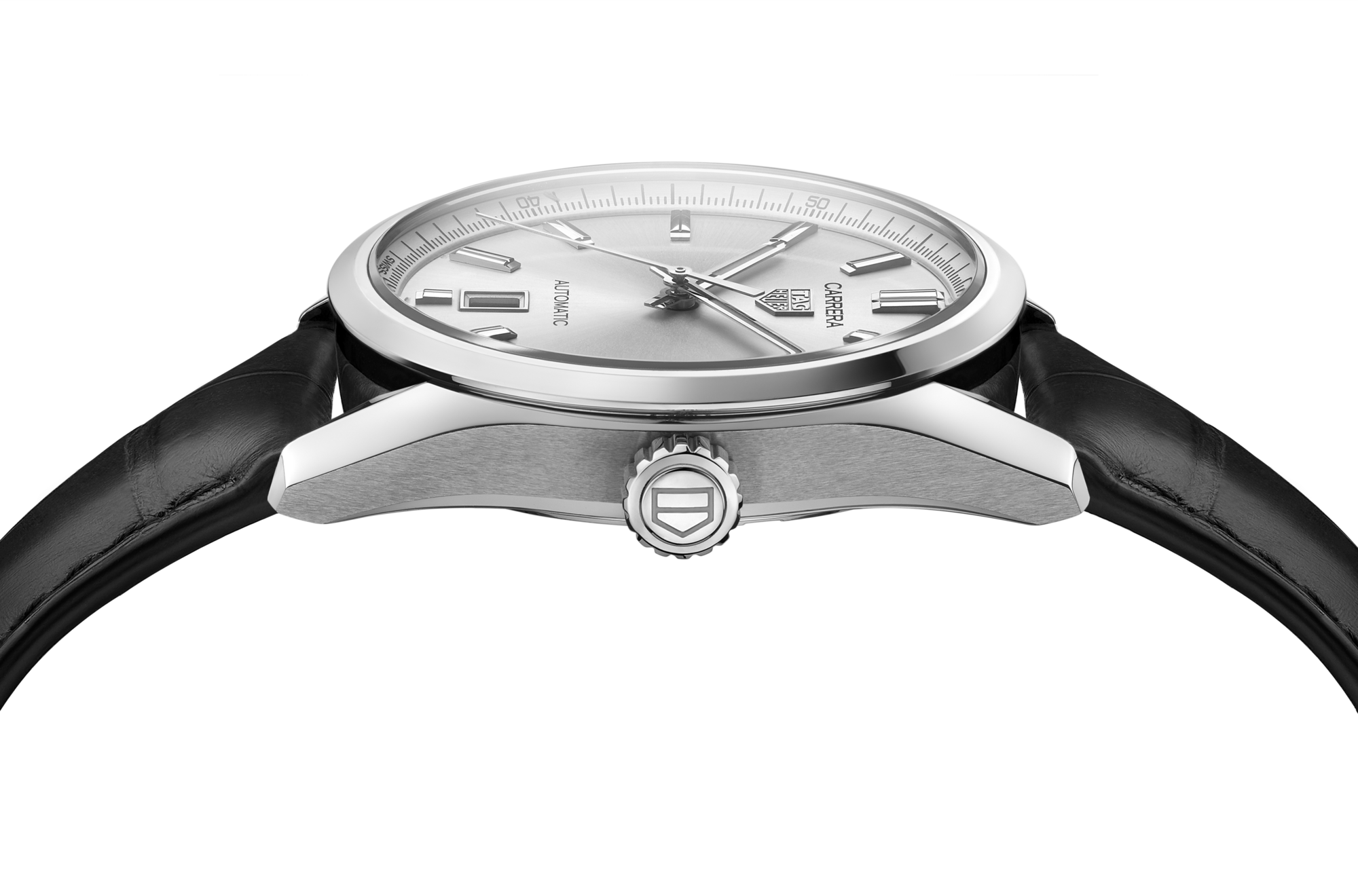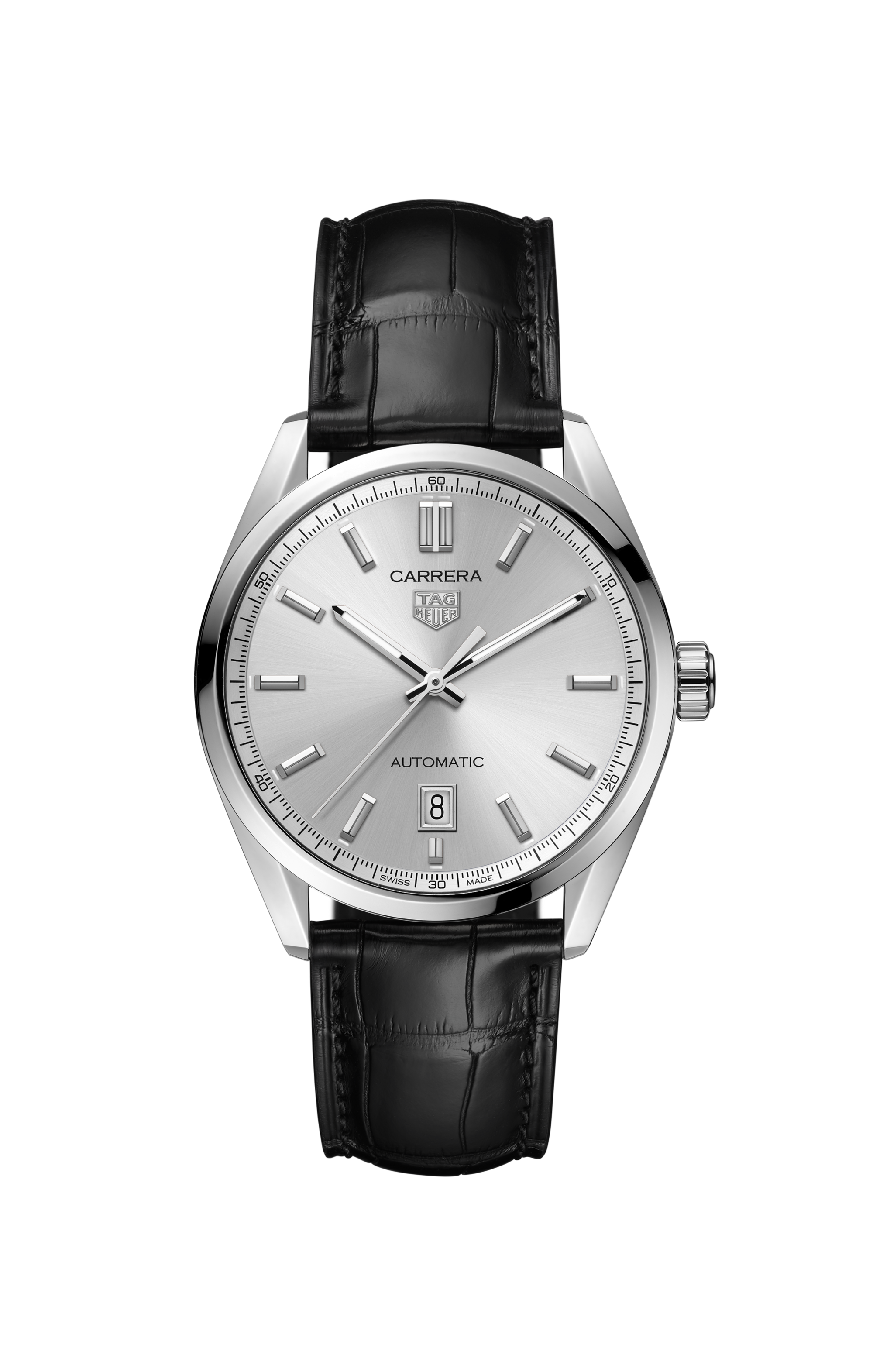 An iconic signature design, the TAG Heuer Carerra blends precision timekeeping with distinctive looks. The indulgent and showy silver sunray brushed dial is complemented by rhodium plated hands, hour markers, and an applied TAG Heuer shield.
