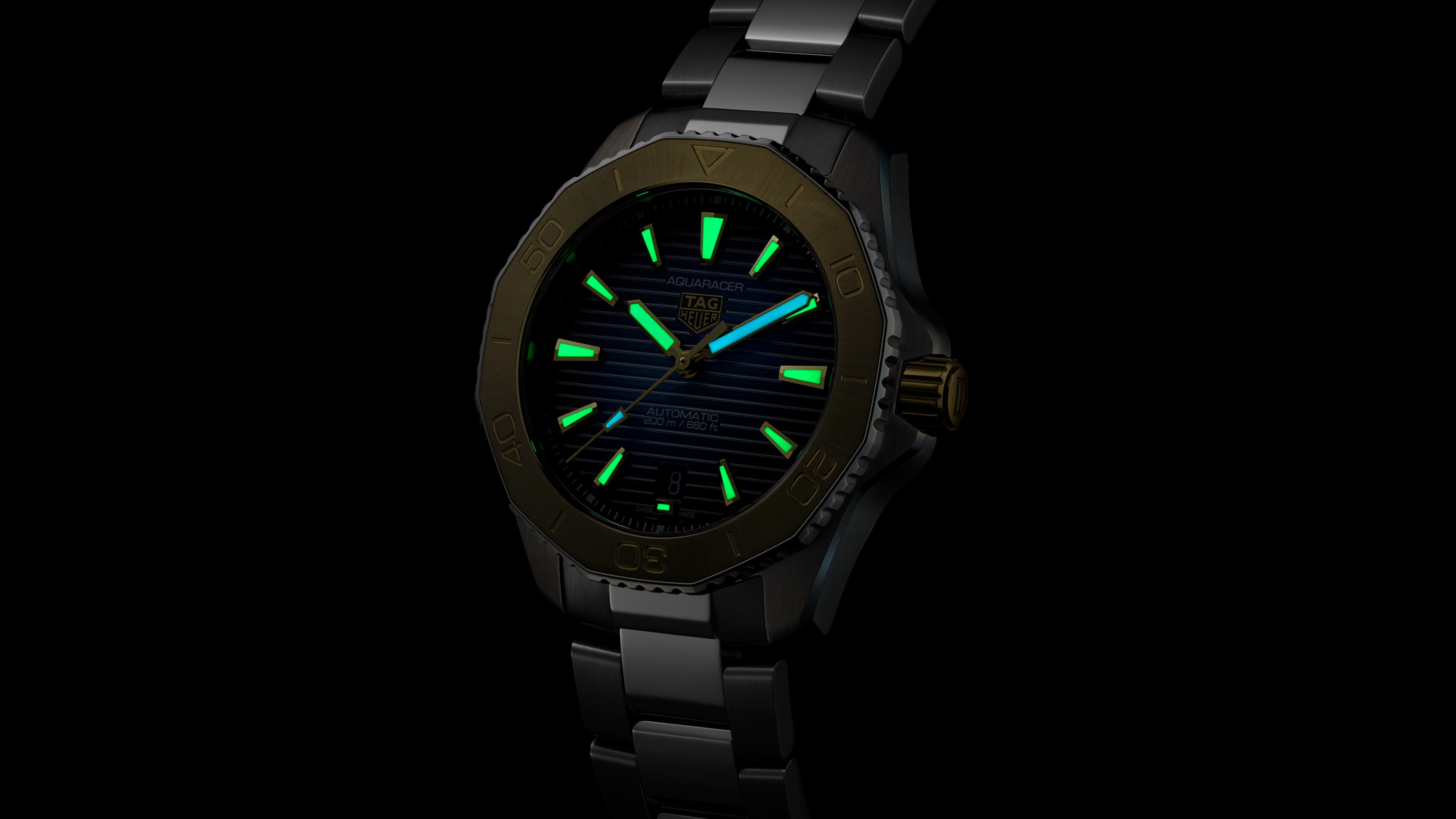 Innegablemente distintivo, este reloj TAG Heuer Aquaracer presenta una cautivadora esfera azul sutilmente ahumada con indicador de día a las 6. Las agujas y los índices chapados en oro amarillo garantizan una legibilidad óptima en cualquier condición.
