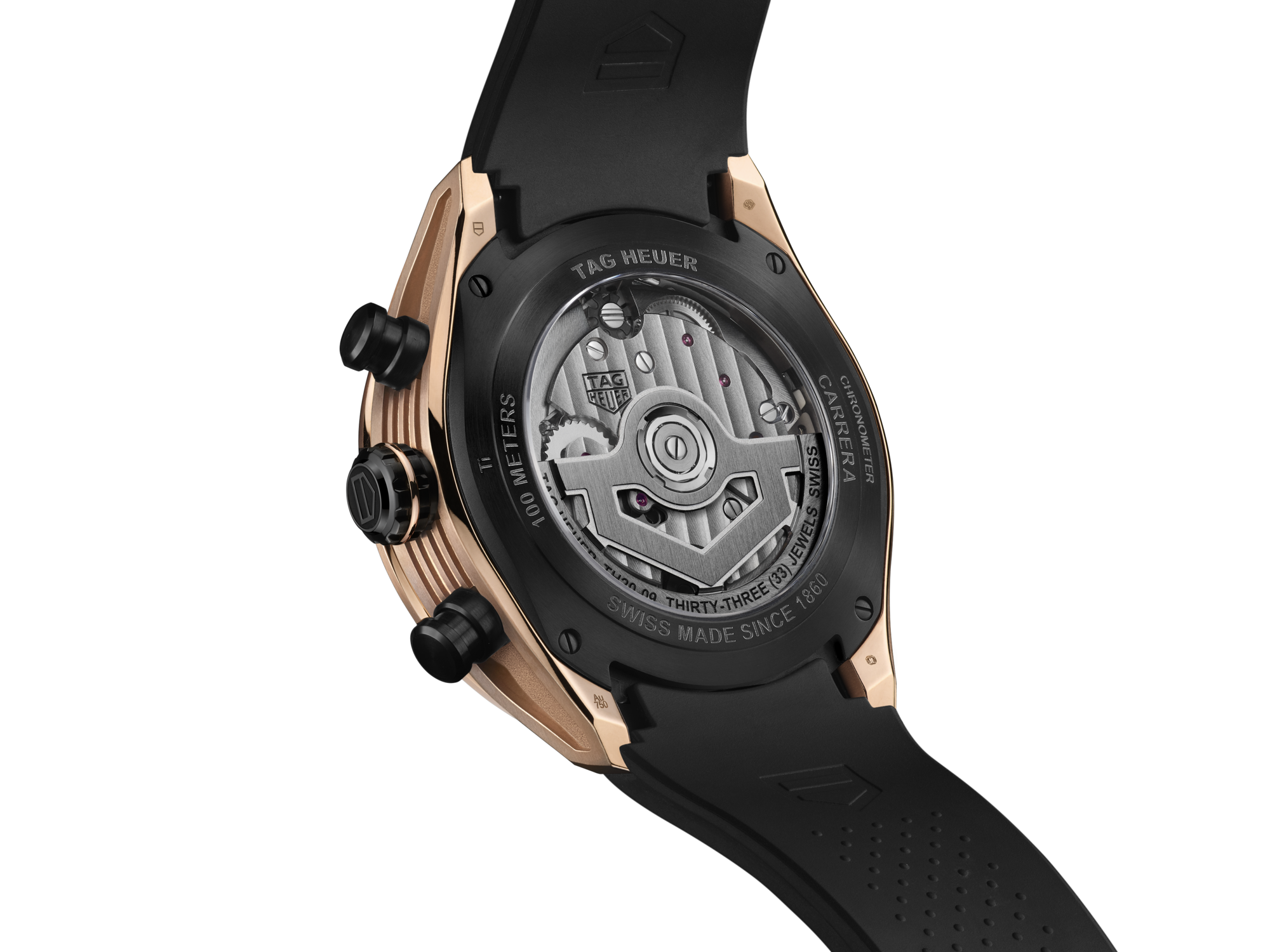 La esfera esqueleto muestra detalles chapados en oro rosa (18 qt 5N) en contraste que ponen de manifiesto la delicada artesanía del reloj.