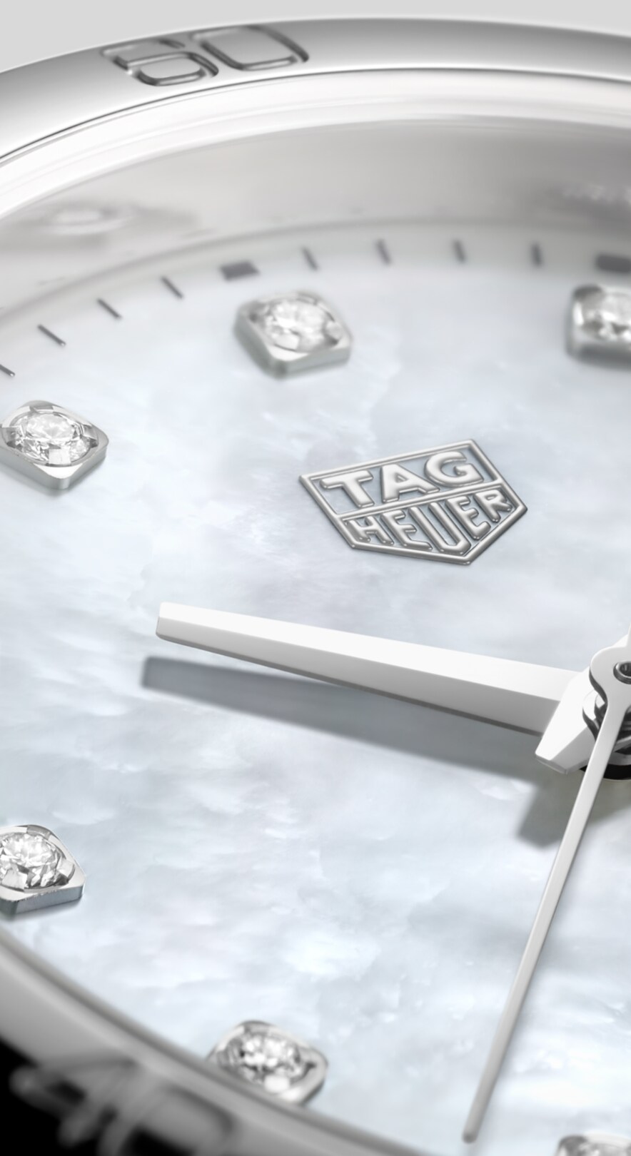 El cristal de zafiro, de mayor dureza que el acero, protege la voluptuosa esfera de nácar, con agujas plateadas y el logotipo de TAG Heuer plateado pulido. Los espléndidos diamantes marcan las horas.