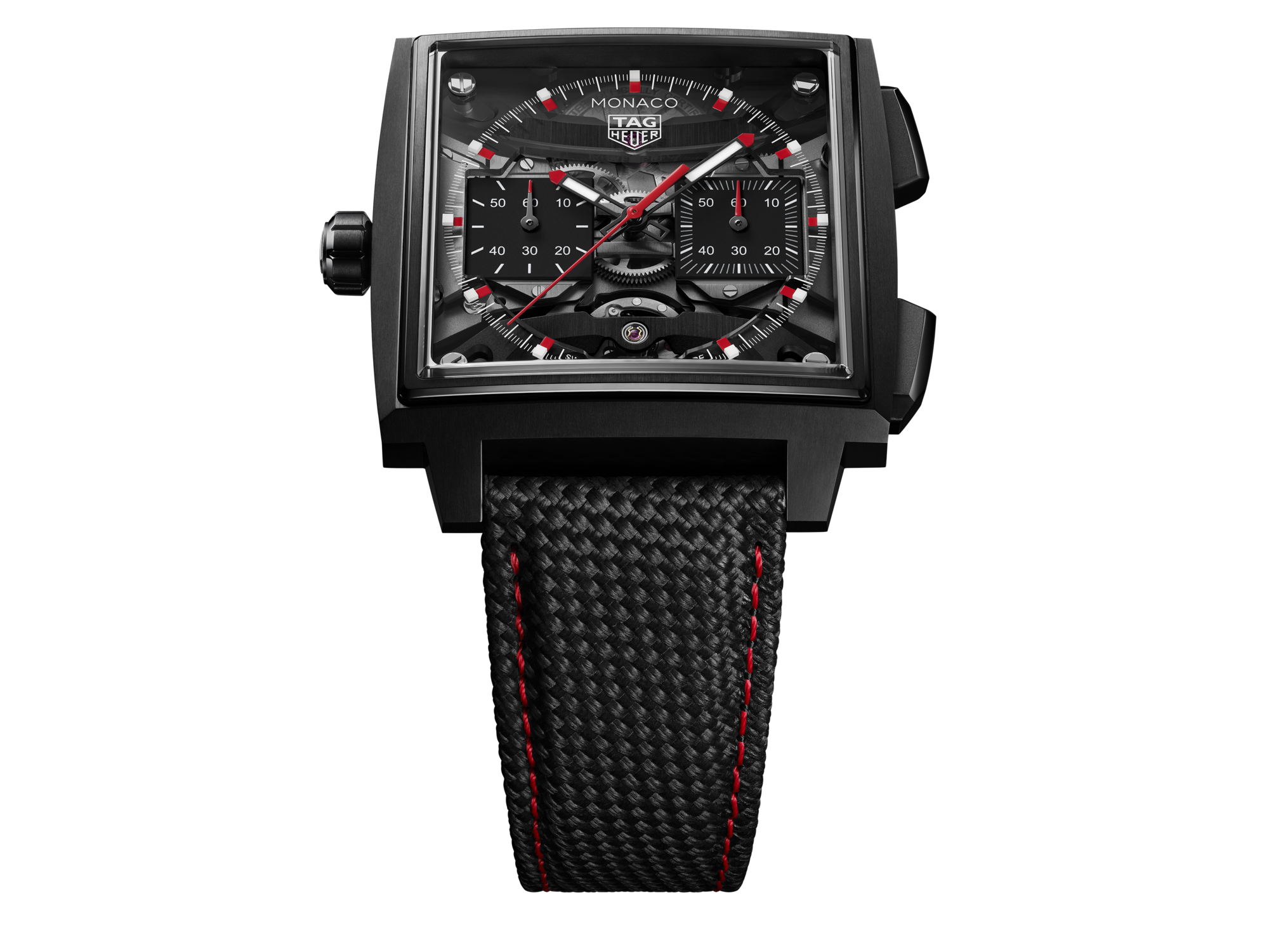La caja de titanio grado 5 de 40 mm, ligera pero imponente, combina ergonomía con un impacto visual. El fondo de caja de zafiro cuadrado enmarca el movimiento cuadrado y sus característicos acabados, mientras que la correa de caucho negro con relieve textil y pespuntes rojos resalta su espíritu automovilístico.