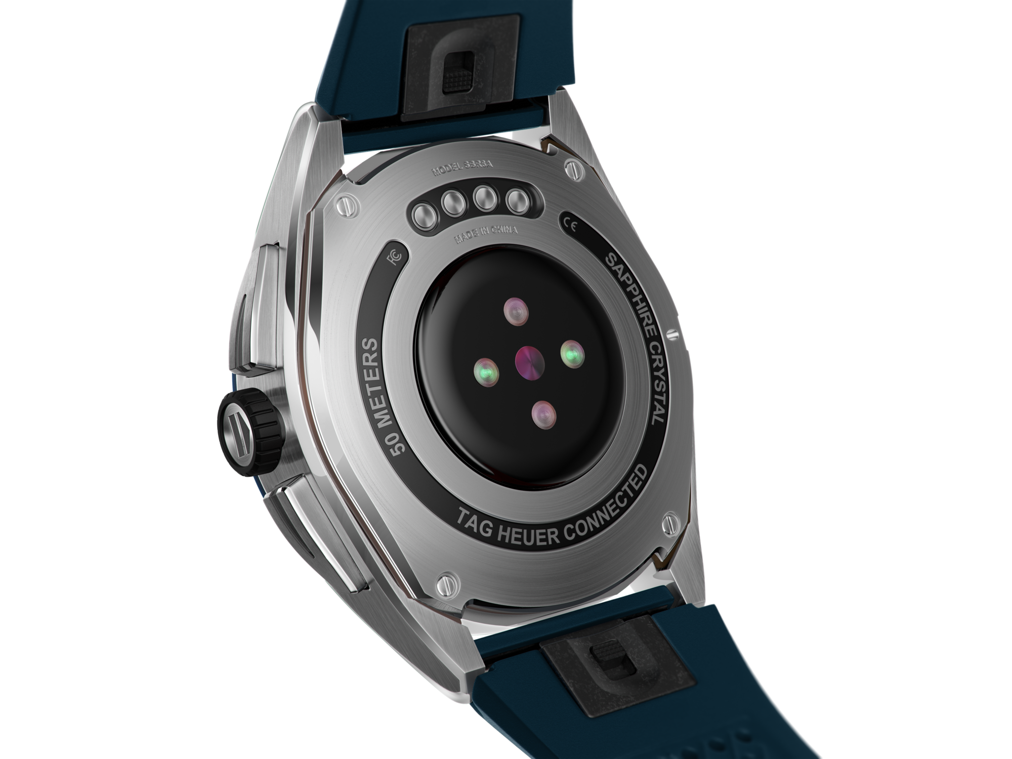 Un bracelet en caoutchouc bleu et une boucle déployante en acier ajoutent une touche distinctive à la TAG Heuer Connected, optimisée et personnalisée pour vos performances.