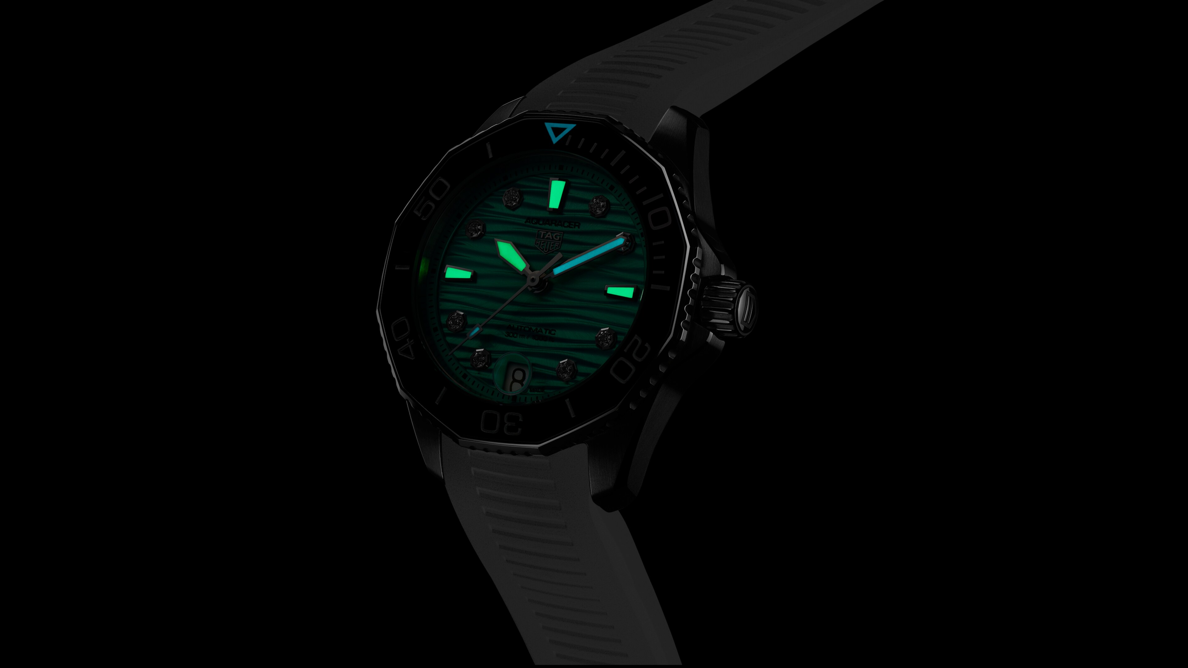 Automatique, 36 mm, Acier WBP231K.FT6234Avec sa couleur saisissante, cette TAG Heuer Aquaracer s'impose comme une montre de plongée robuste tout en évoquant les couleurs de la mer. Le bracelet blanc facilement ajustable contraste parfaitement avec le cadran turquoise profond. Disponible en exclusivité sur TAGHeuer.com