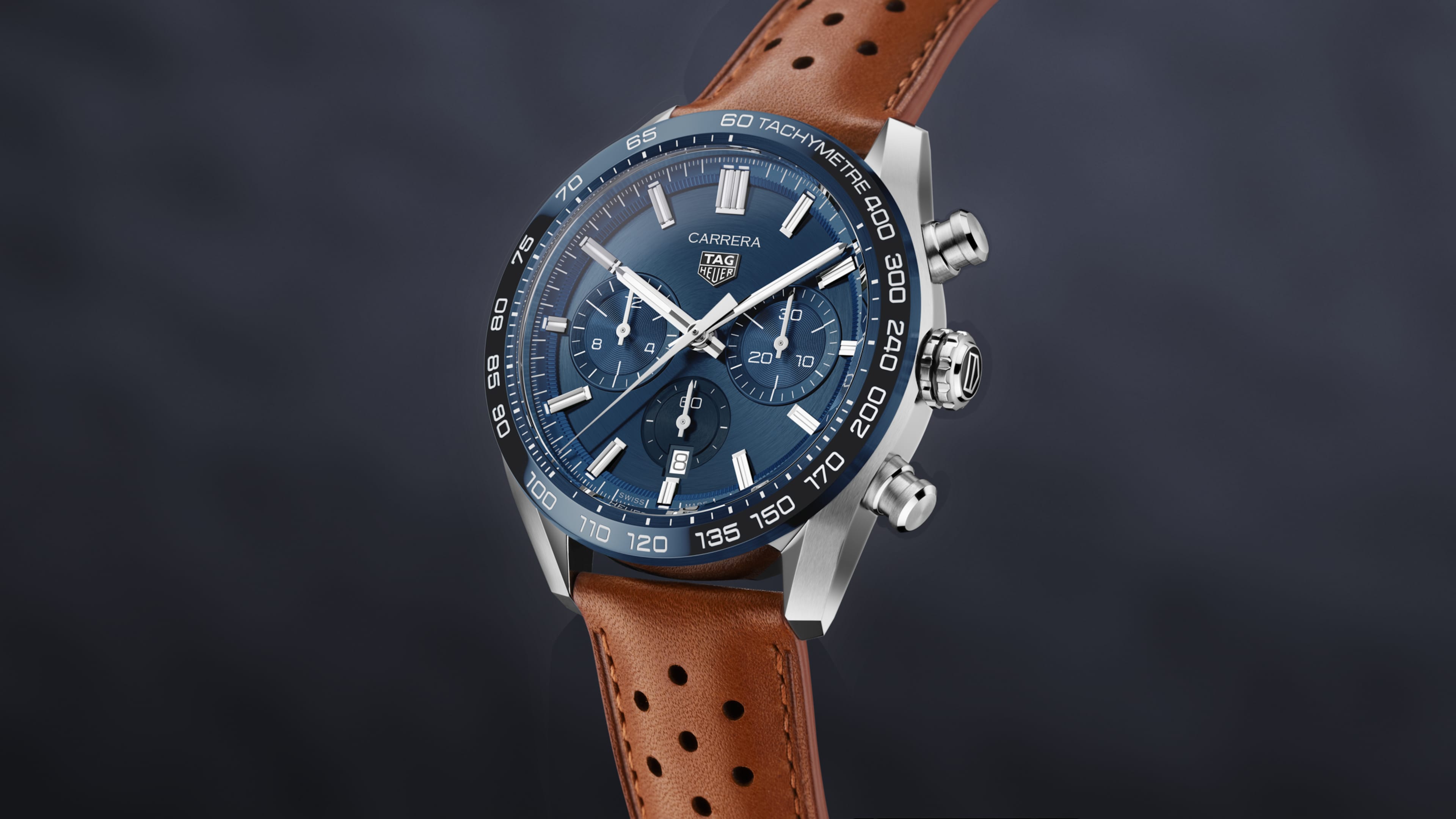 自动机芯, 44 mm, 精钢 CBN2A1A.FC6537这款奢华的泰格豪雅卡莱拉系列腕表配备棕色穿孔小牛皮表带,搭配蓝色衬里,与表盘和表圈互为呼应,以标志性设计追求精准度。经典计时码表,全新激扬外观。