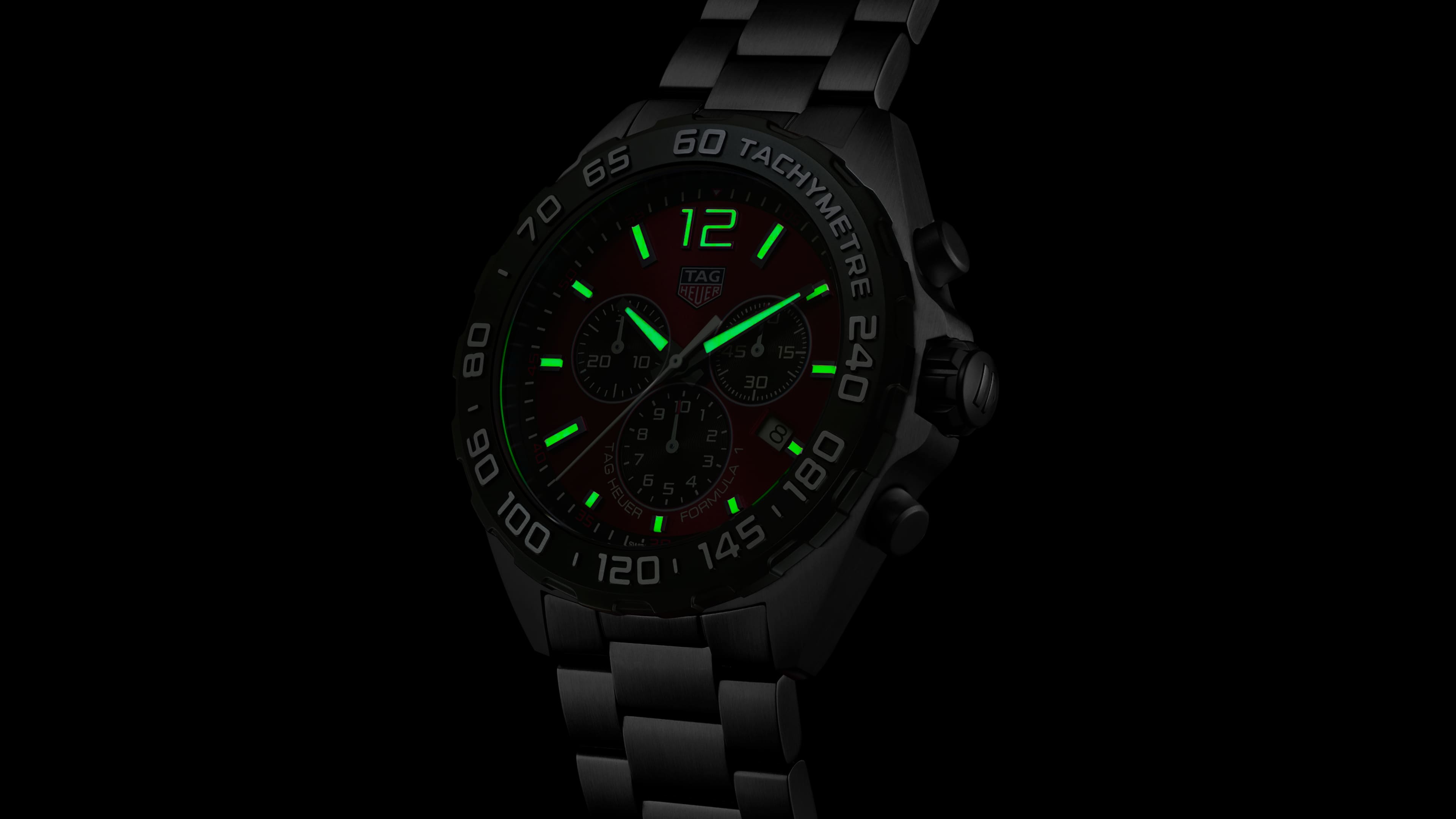 火红色太阳纹磨砂表盘,搭配三个带夜光效果的黑色副表盘,以及极为易读的Super-LumiNova®荧光涂料指针和时标。