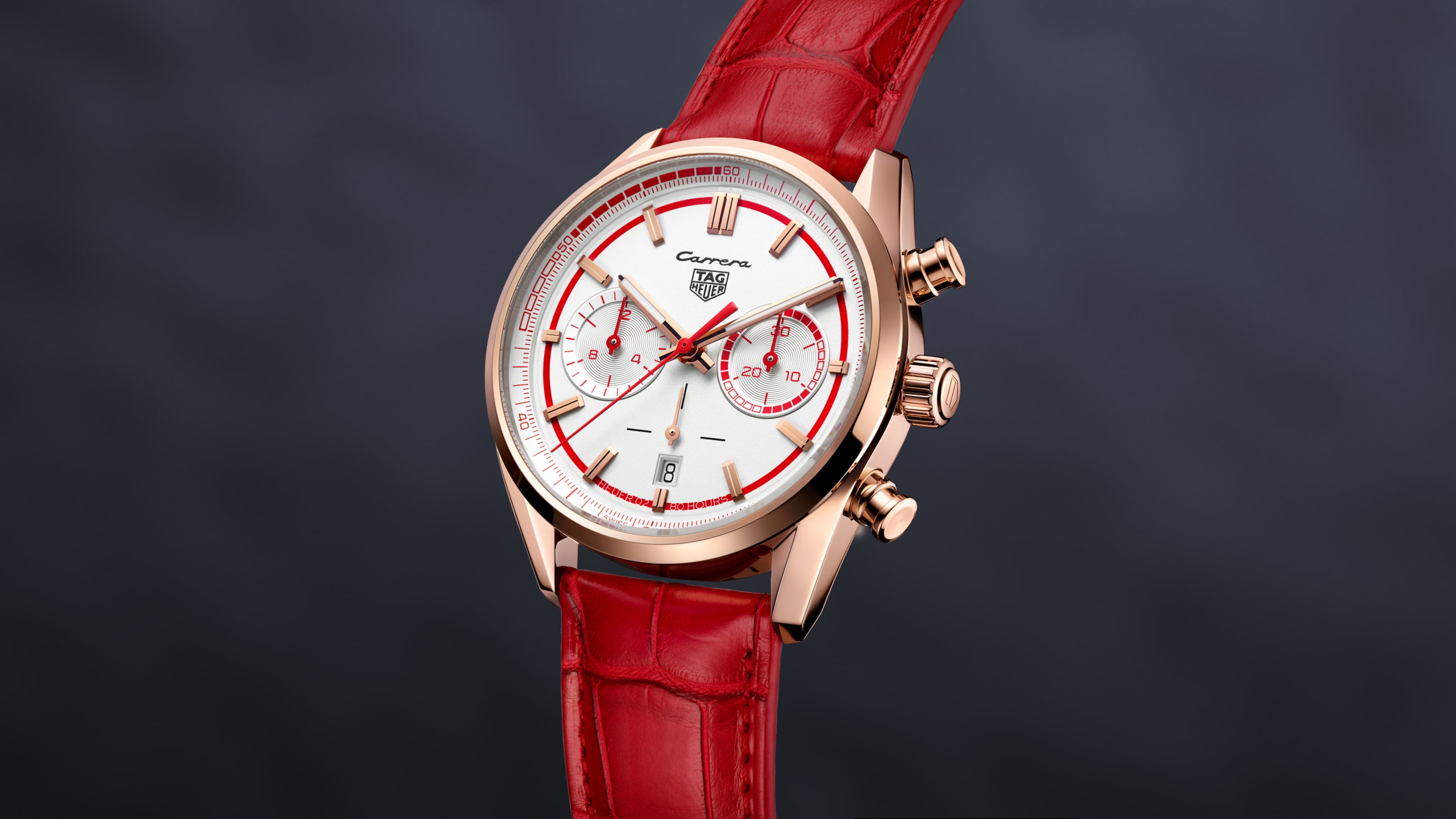 Drive to surpass with a striking livery in red and white, perfectly accented by the bold Carrera branding on the dial, case profile and strap.