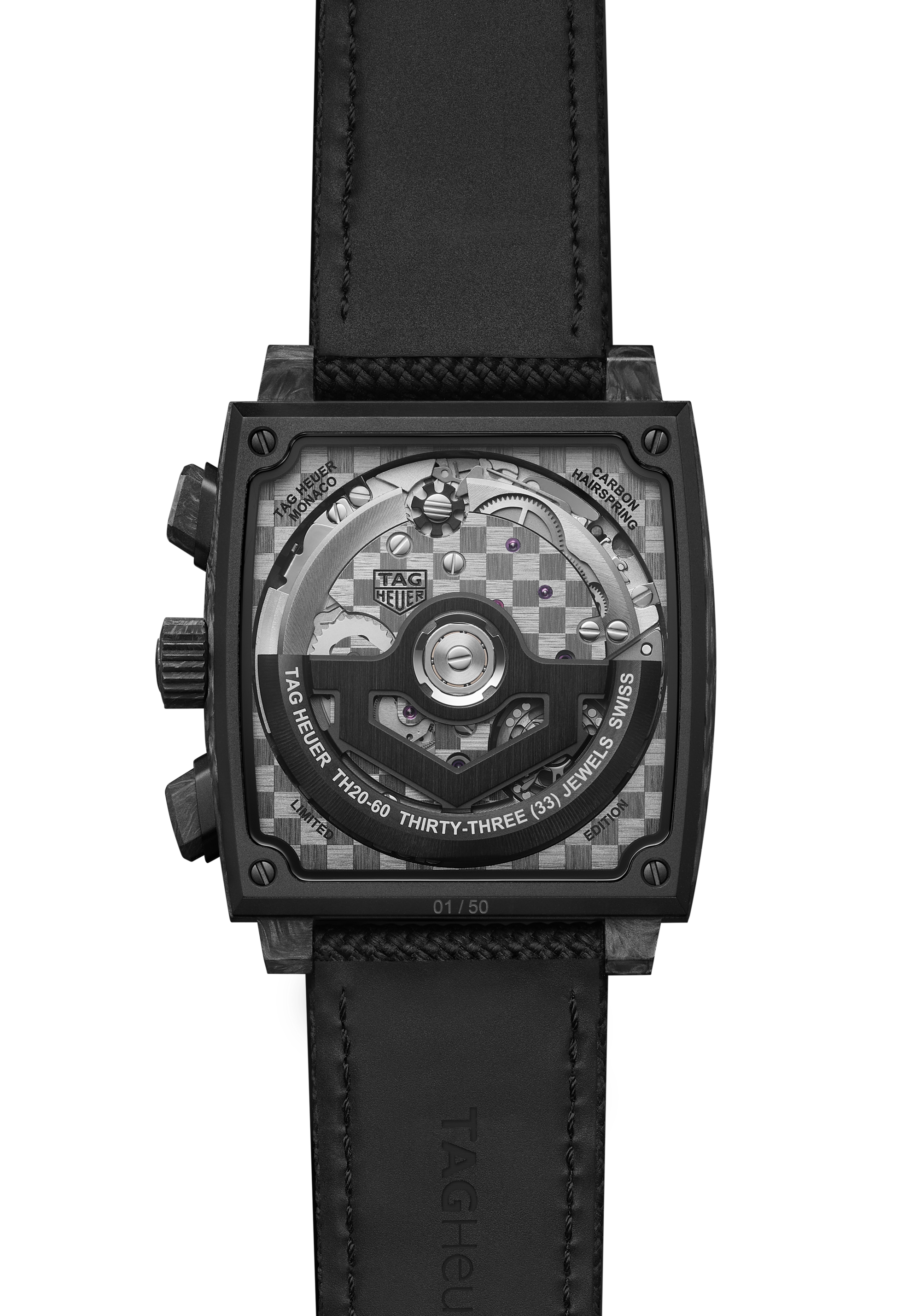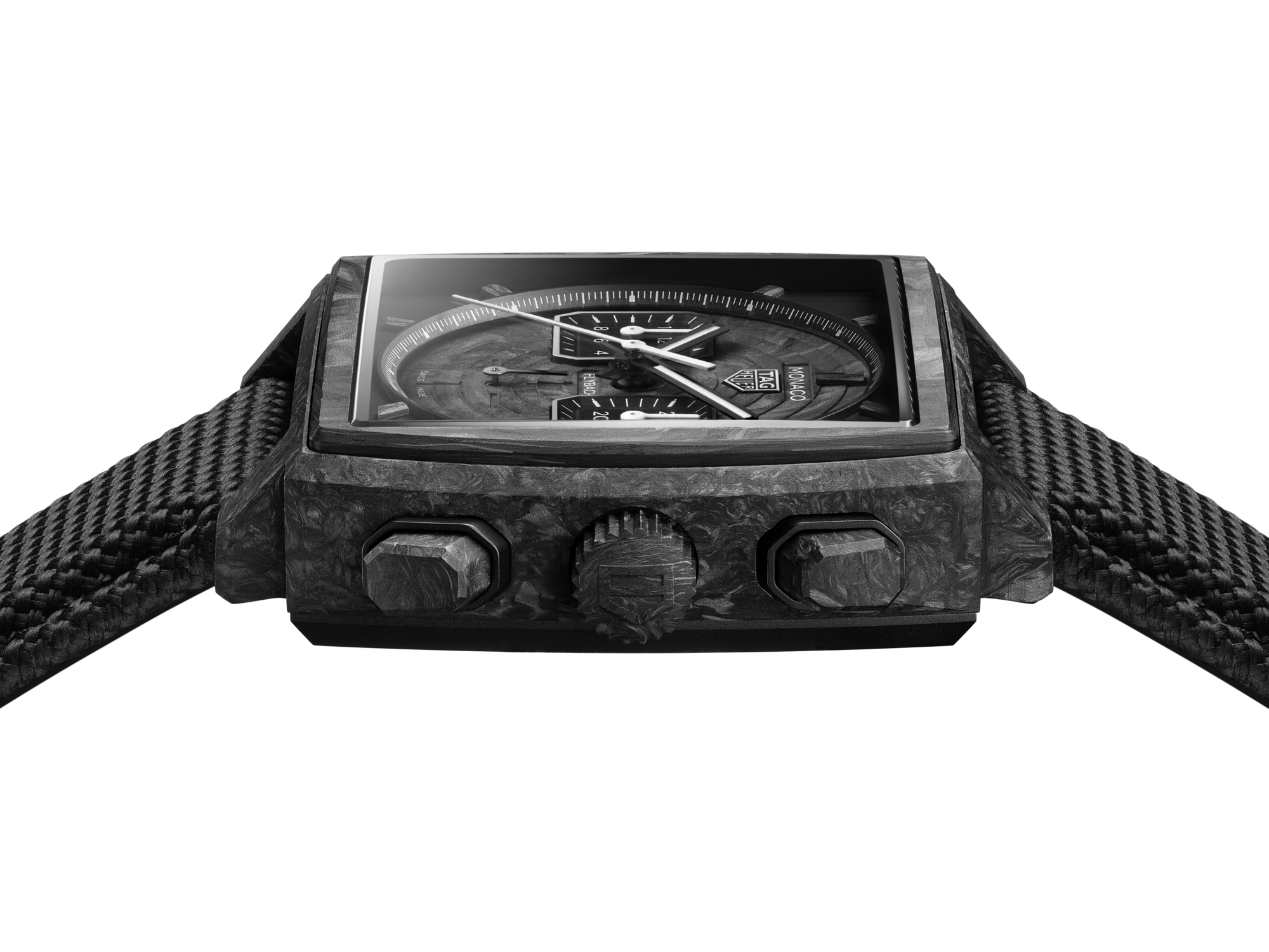 From the 39mm square carbon case to the forged carbon pushers and crown, along with the titanium caseback coated with black DLC, every structural element has been engineered for lightweight performance and stealth aesthetics, while remaining true to the Monaco signature design codes.